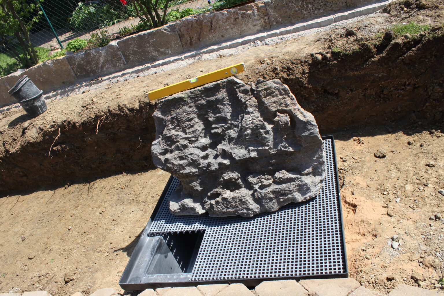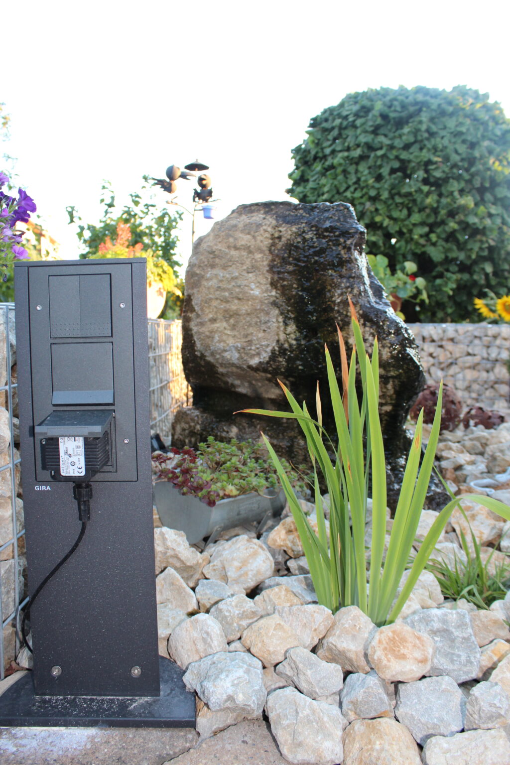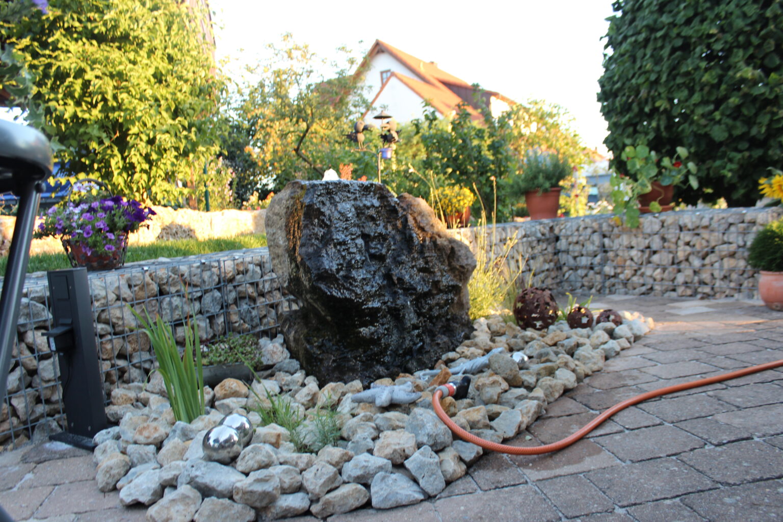 Im Terrasseneck hat sich hier ein schöner Quellstein ins Bild eingefügt. Unter dem Quellstein ist ein Becken verbaut, welches das Wasser immer wieder auffängt. Somit kann die Pumpe immer wieder das gleiche Wasser in den Quellstein pumpen und man spart Resourcen.