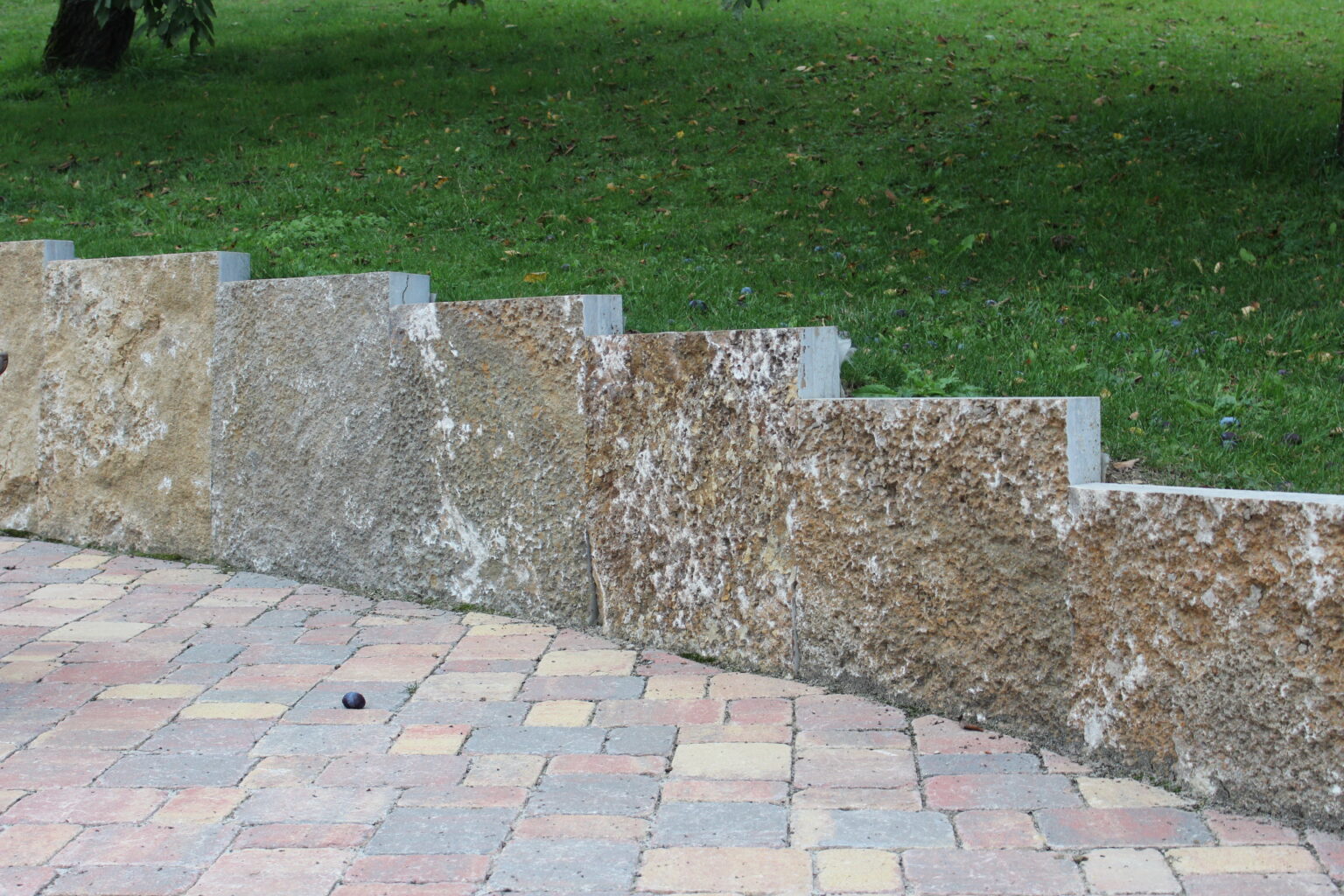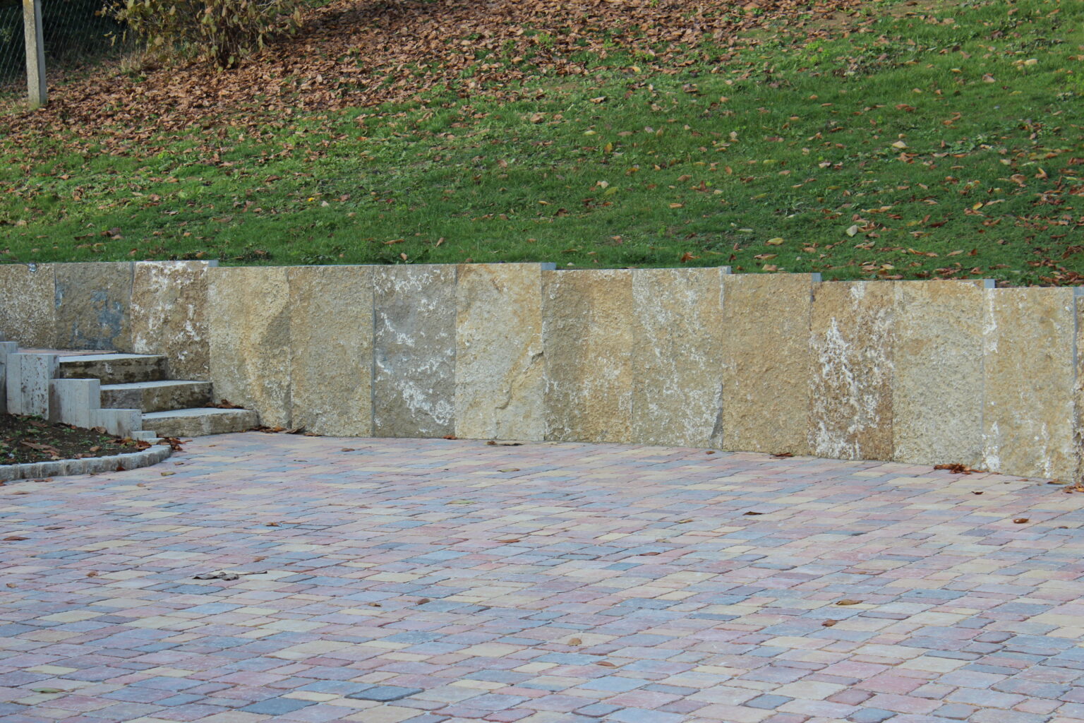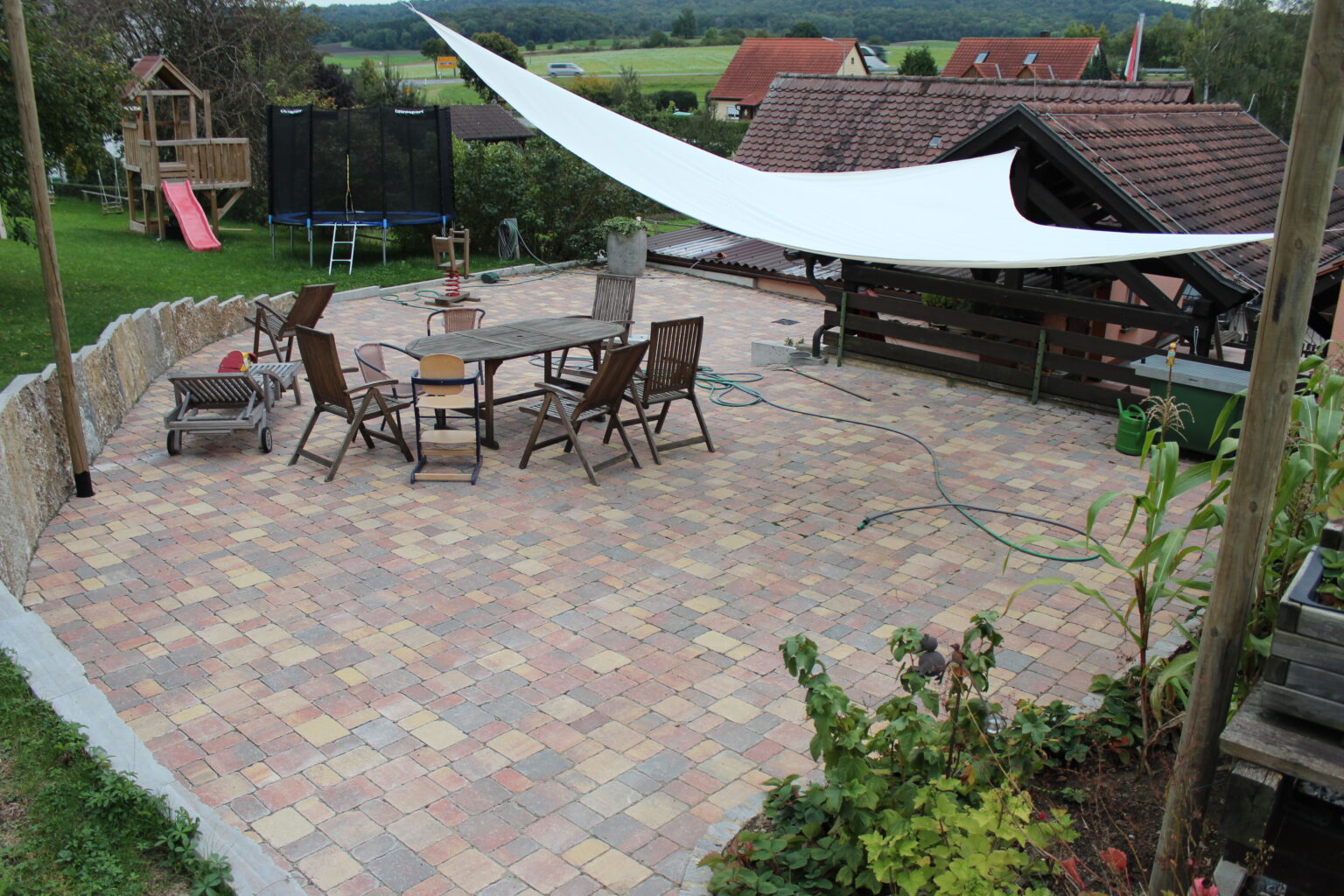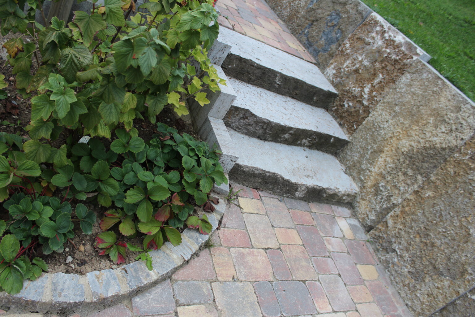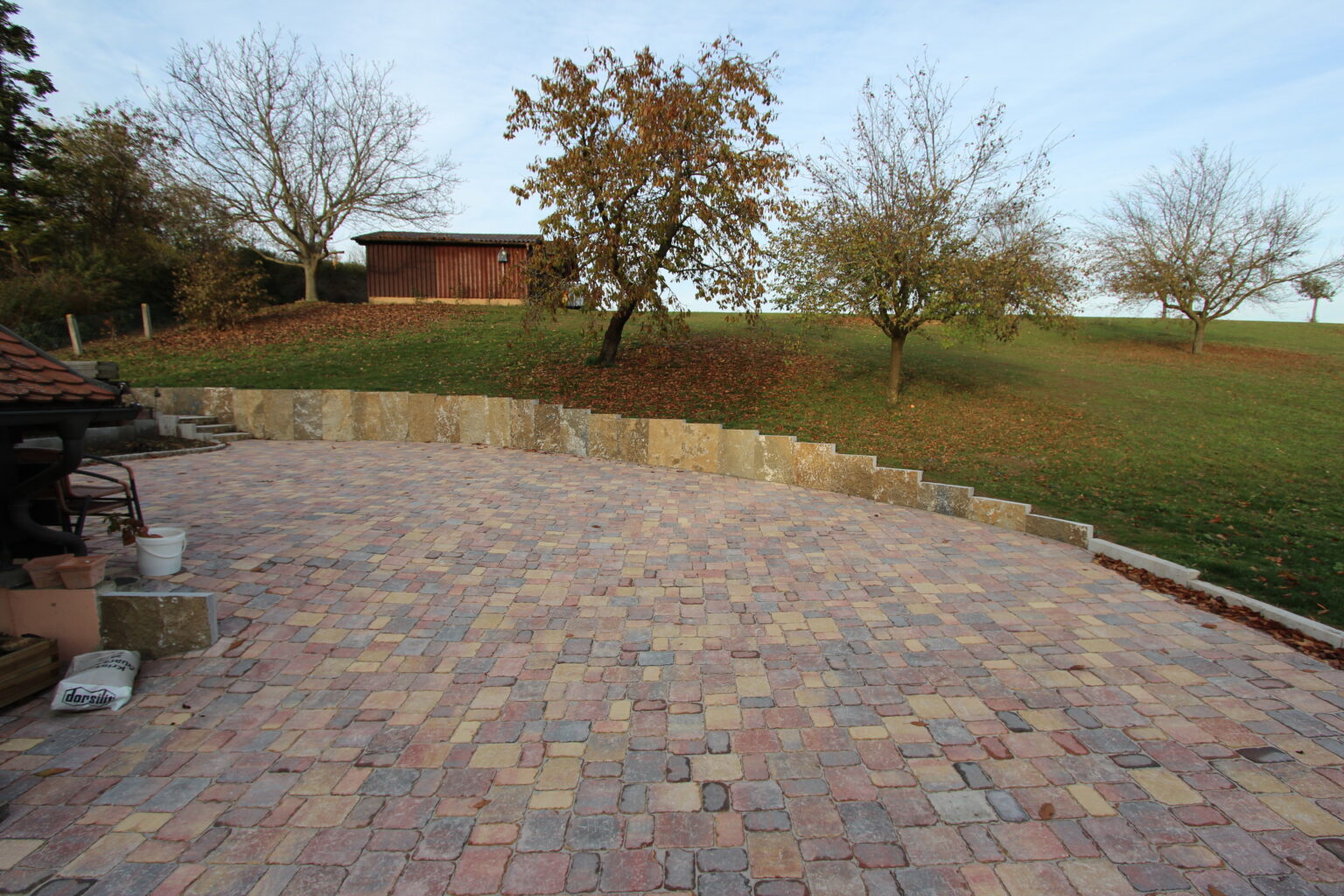 Damit man eine schöne gerade und vorallem große Terrasse erhält wurde hier der Hang mit Muschelkalkplatten abgefangen. Eine Muschelkalktreppe mit Blockstufen führt zudem in den Nutzgarten.