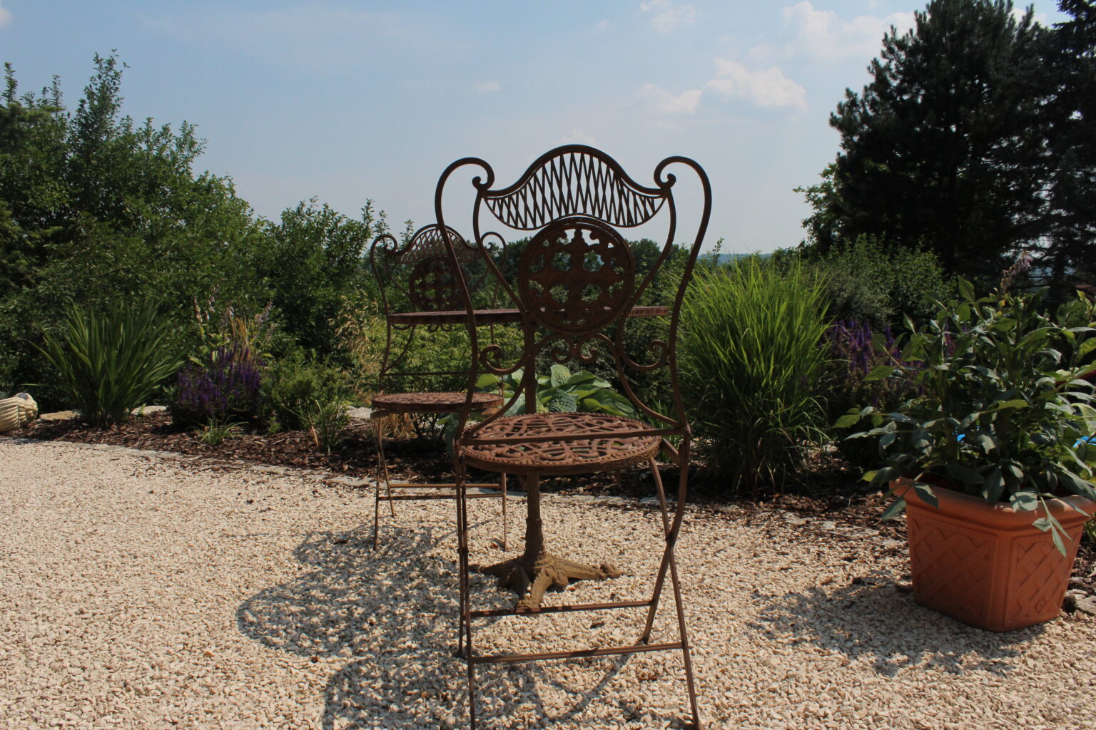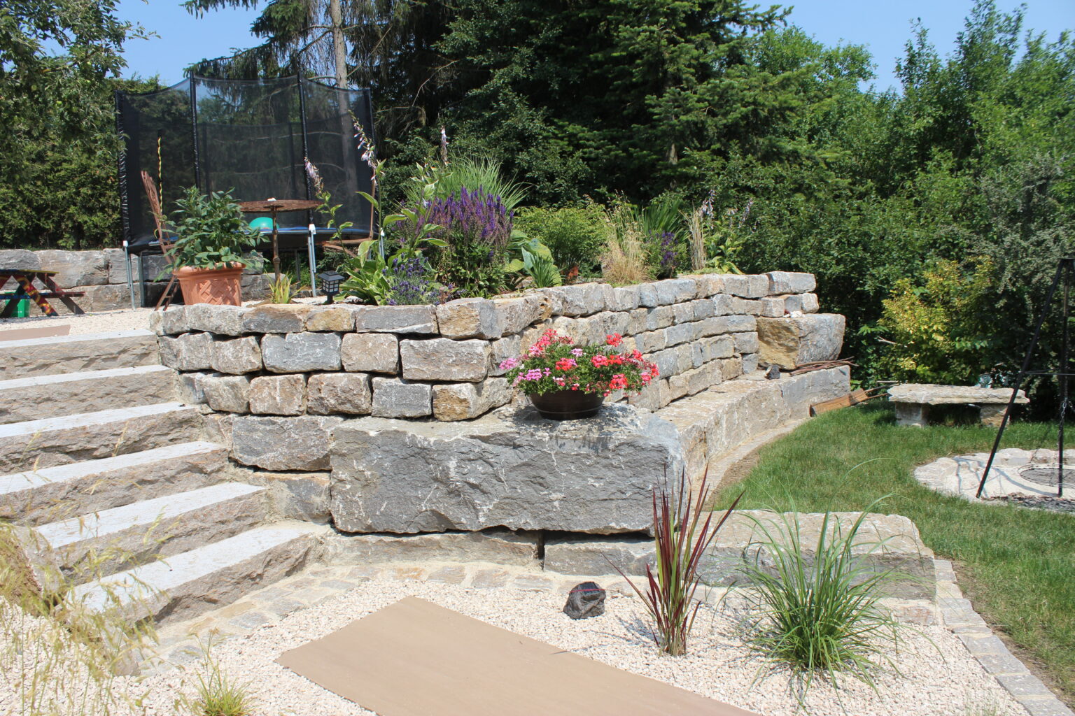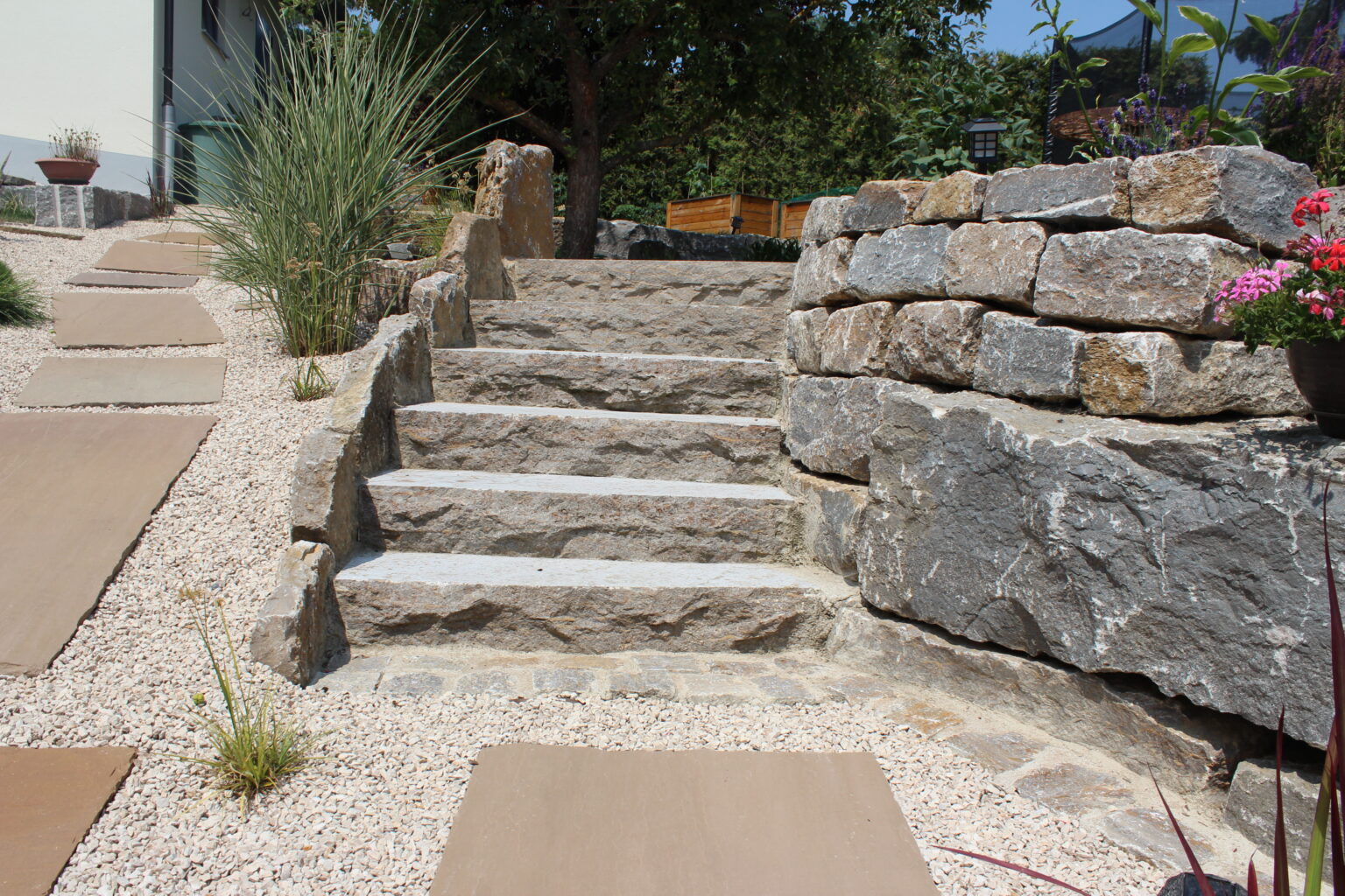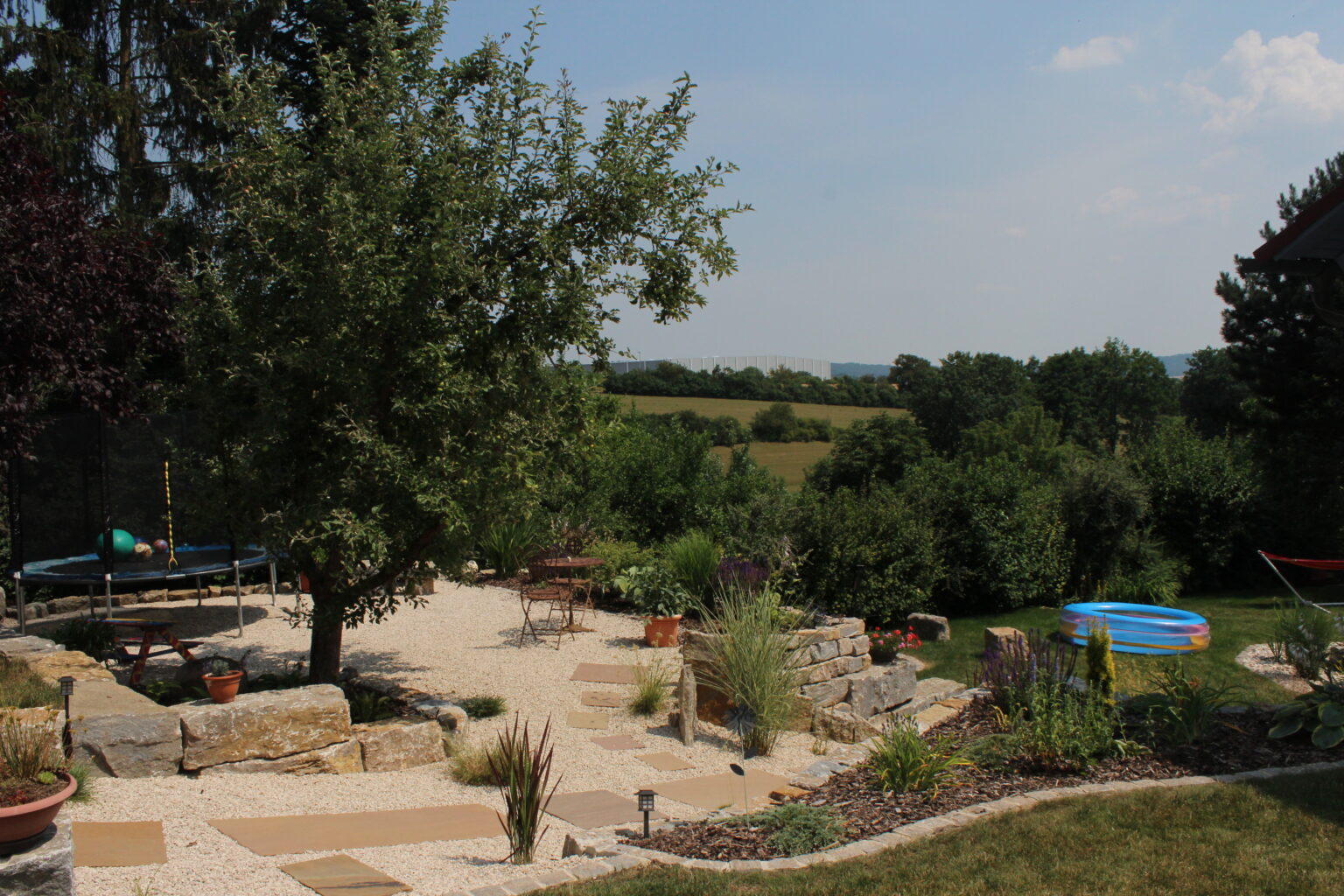 Hier wurde mit vielen verschienden Steinen aus Muschelkalk gearbeitet. Eine Muschelkalkmauer fängt die Hanglage ab, um einen schönen Platz zum Verweihlen zuschaffen. Mit den großen Quarzidsandsteinplatten wurde ein Weg durch den Garten den Hang hinauf geschaffen. Um den Weg etwas aufzulockern wurde dieser mit losen Schottersteinen gefüllt und mit Gräsern bepflanzt.