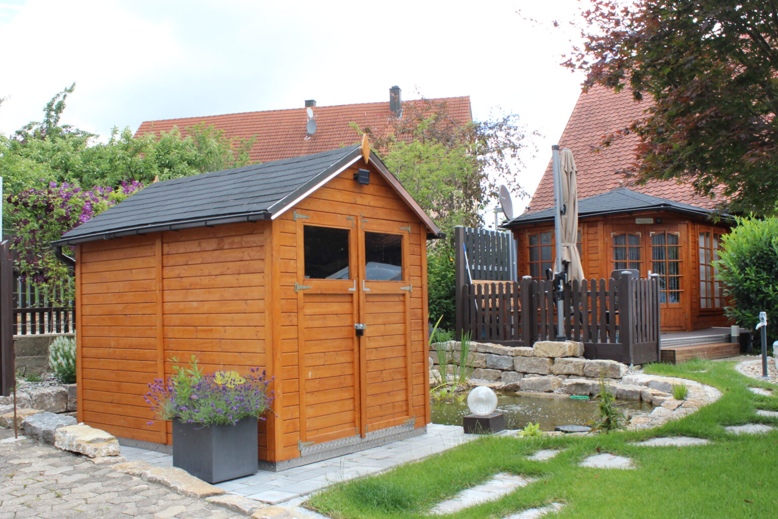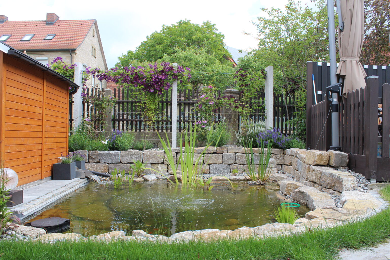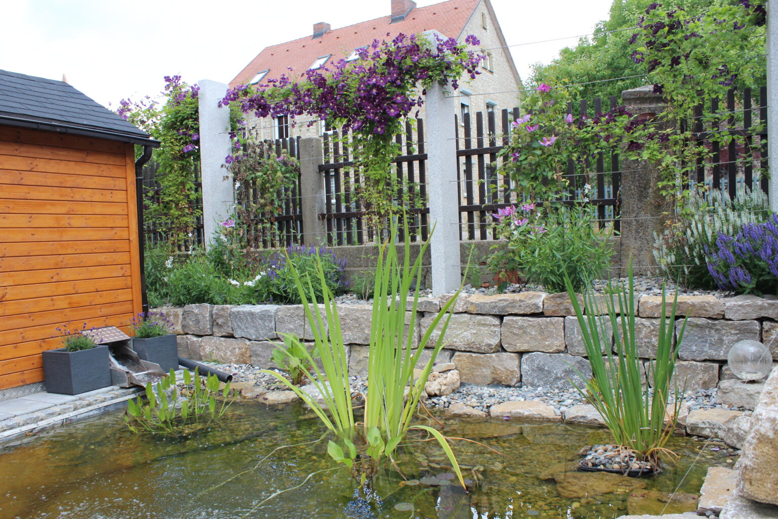 Der Gartenteich umrahmt mit einer Gartenhütte und einem offen gestalteten Zaun als Sitzschutz.