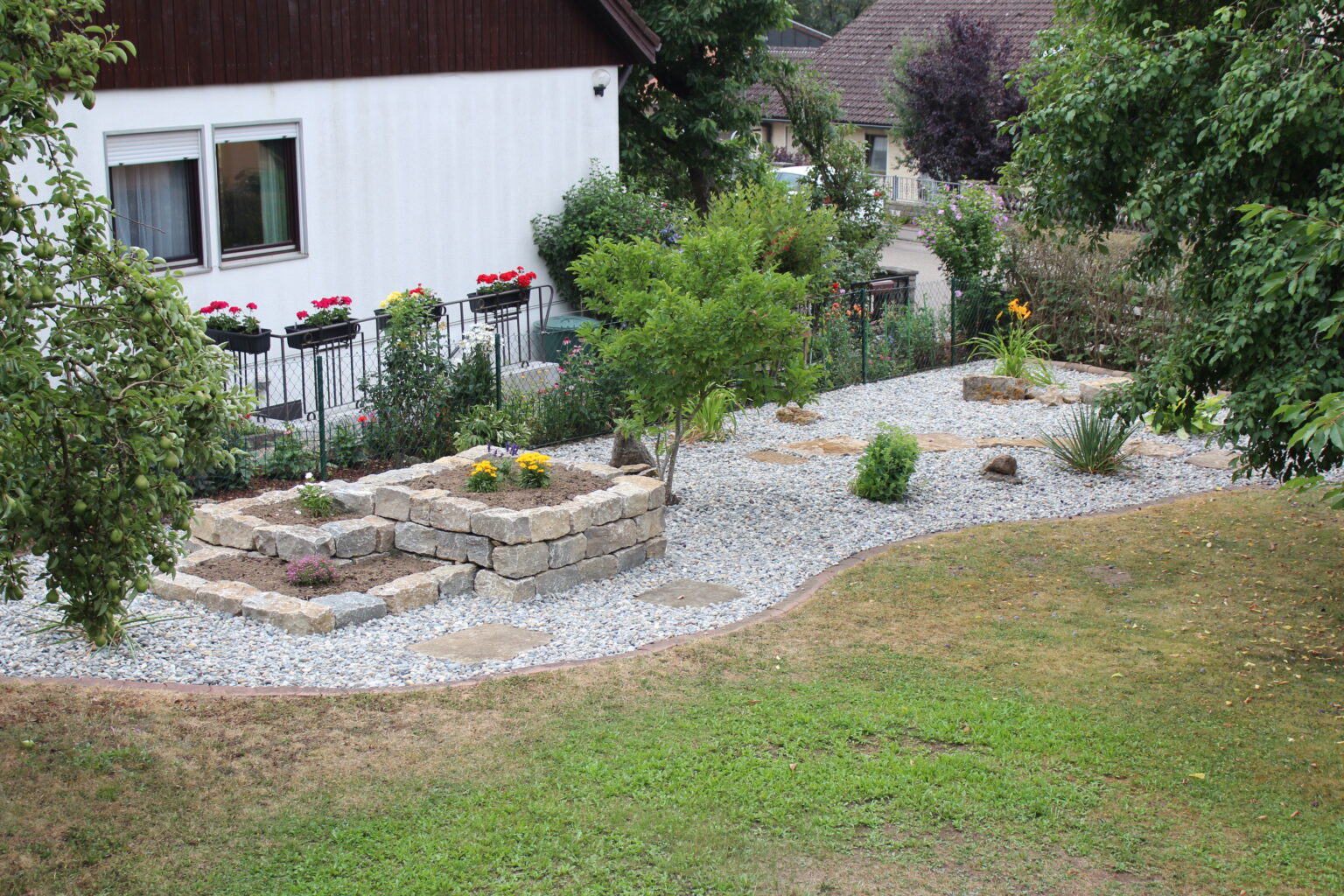 Im hinteren Teil des Gartens wurde ein größeres Pflanzbeet mit kleinem Hochbeet erstellt.