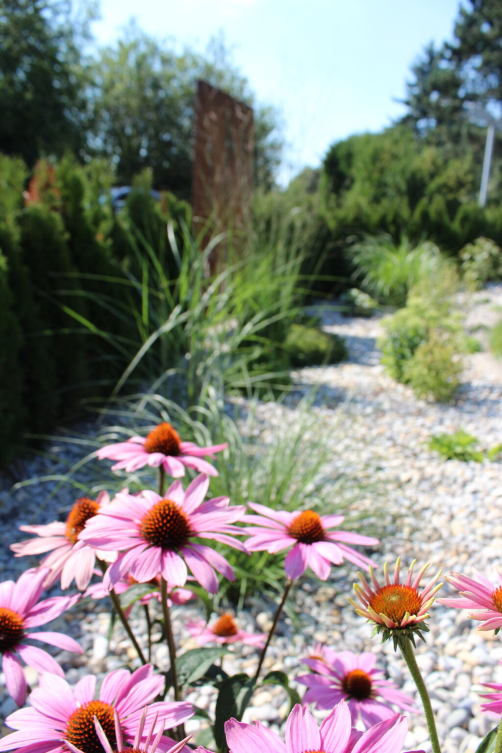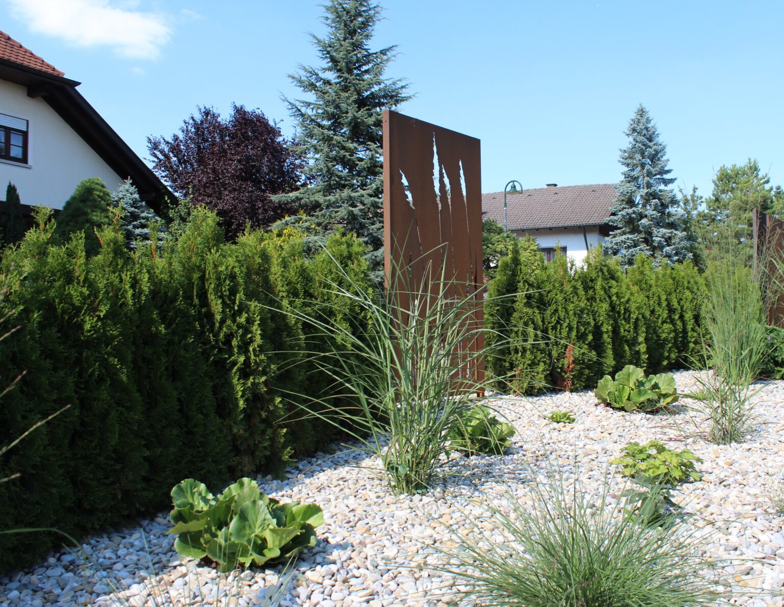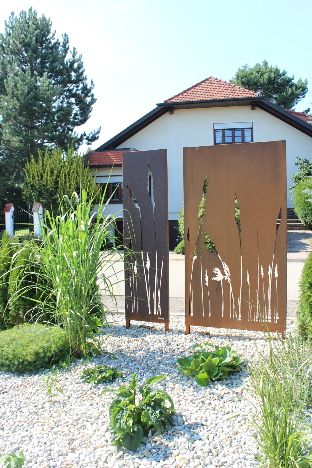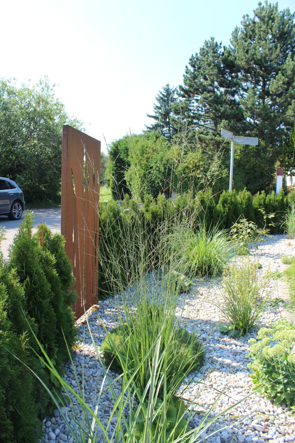 Ein pflegeleichtes Pflanzbeet wurde hier mit Stauden und einzelnen Cortenstahlplatten gestaltet.