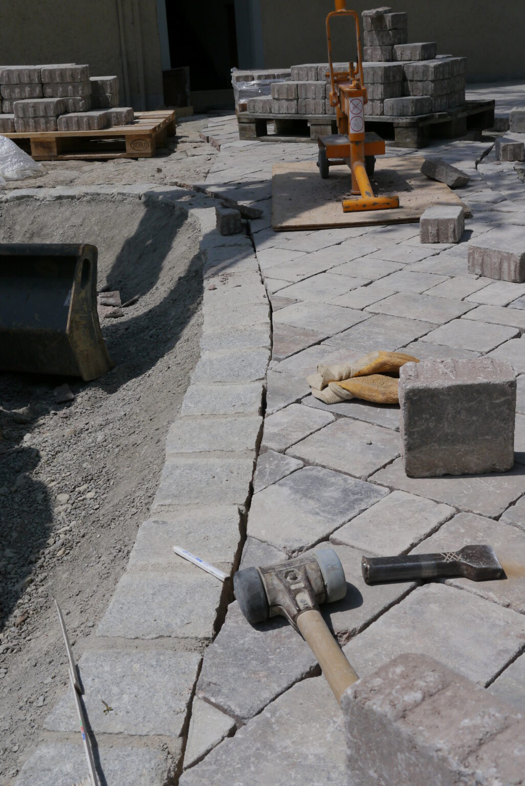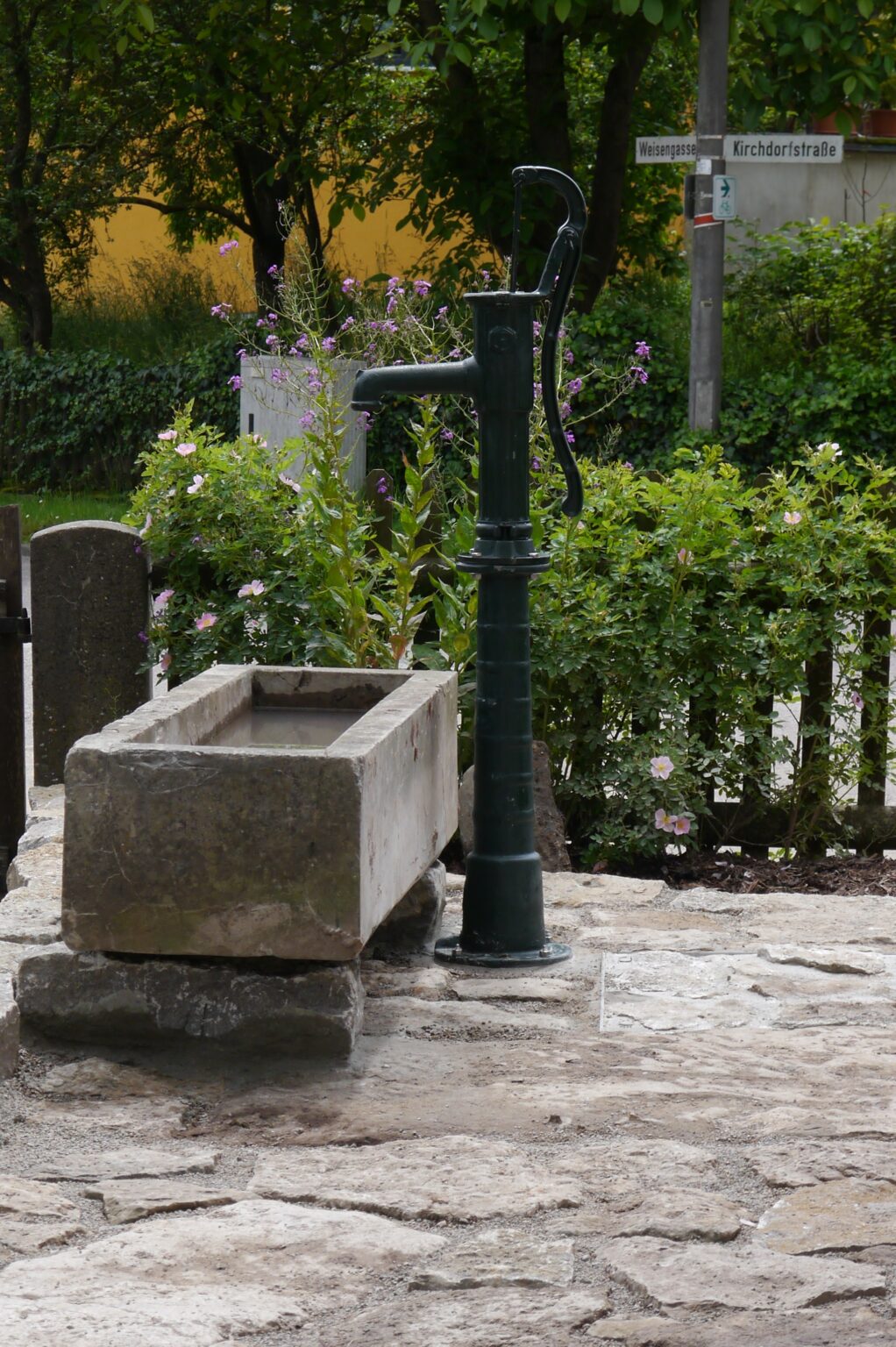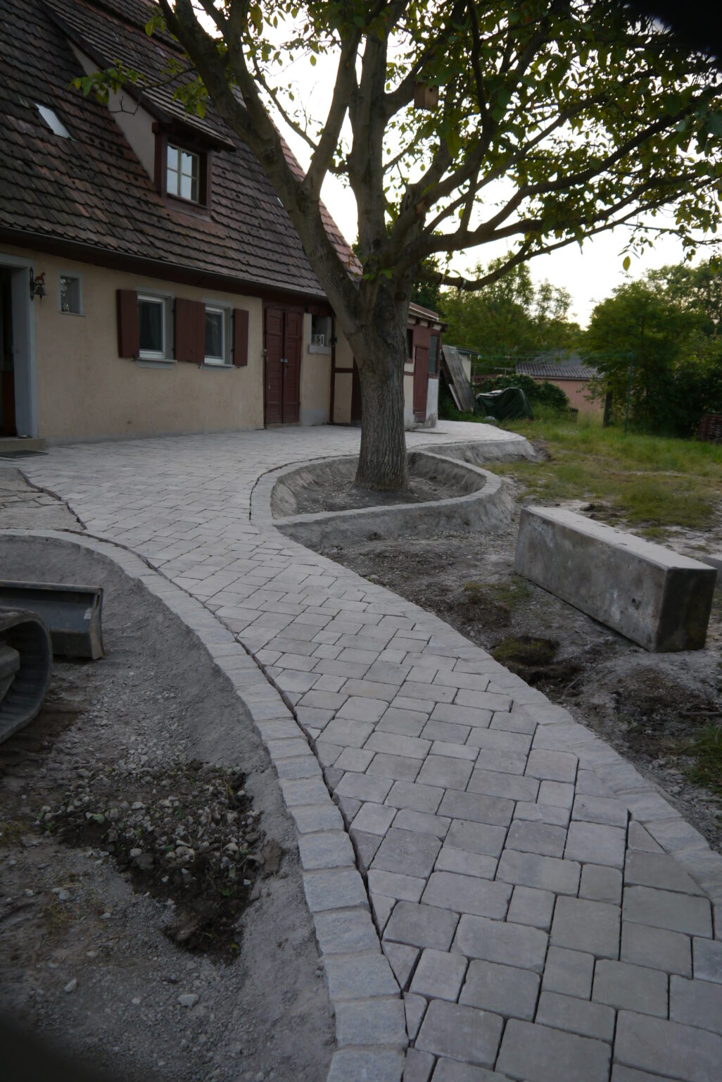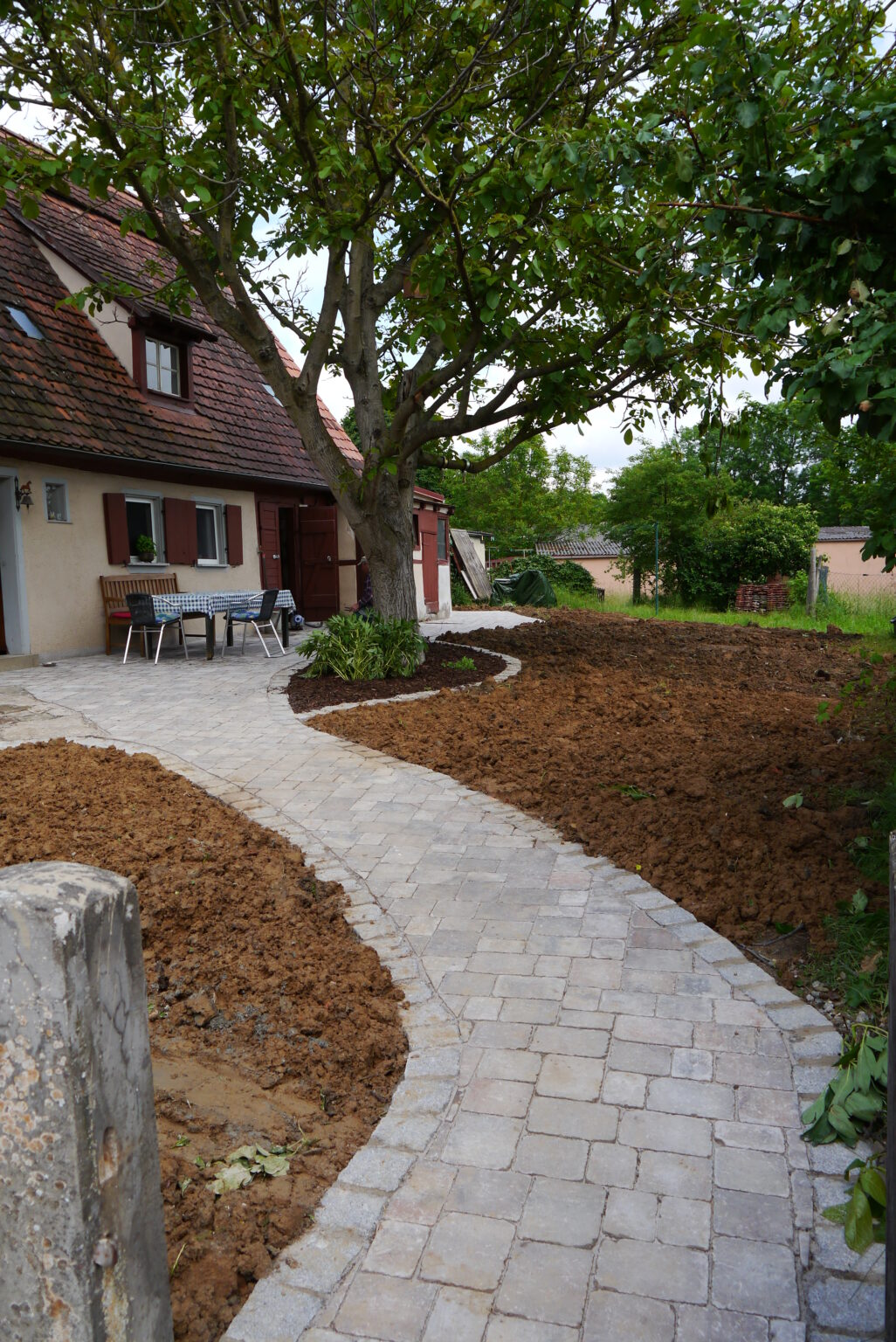 Mit einem schönen neuen Gartenweg wurde hier Neues mit Altem gut verbunden. Auch der Brunnen und die groben Pflasterplatten fügen sich perfekt zusammen.