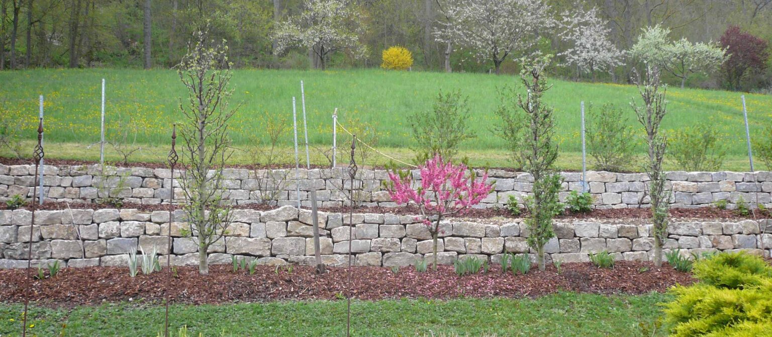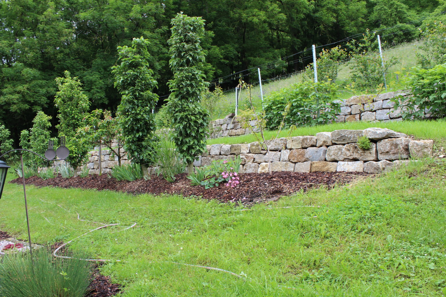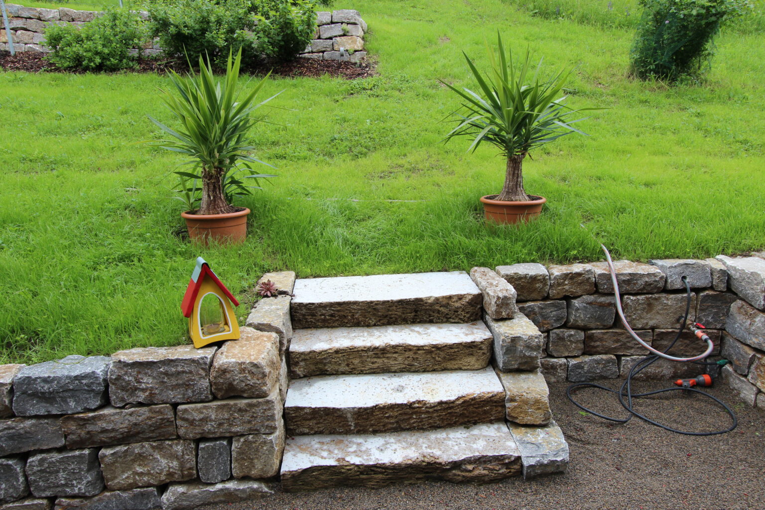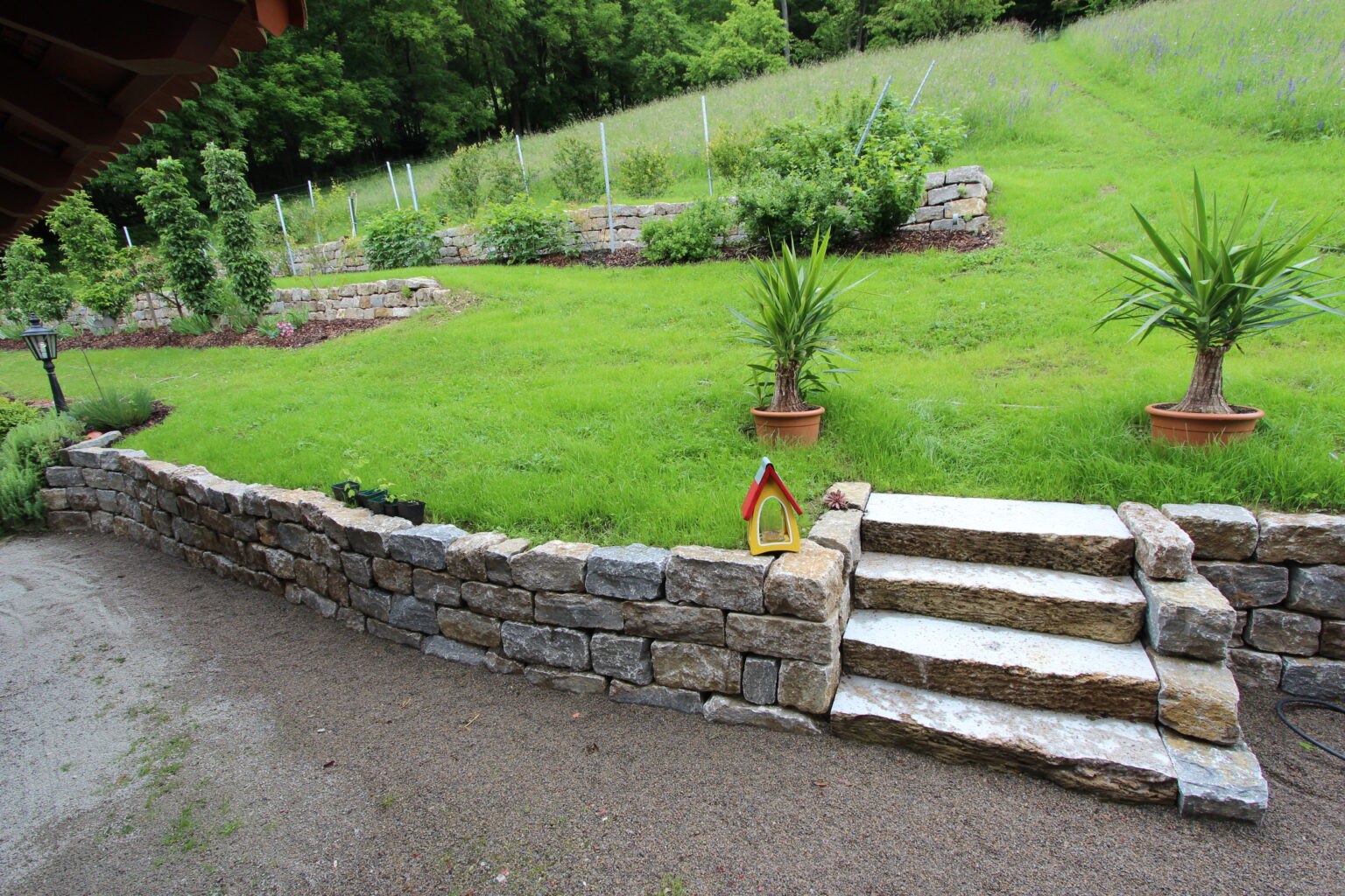 Hier wurde mit meheren Muschelkalkmauern der Hang abgesichert und schön bepflanzt. Auch eine Treppe mit Muschelkalkblockstufen wurde gebaut.