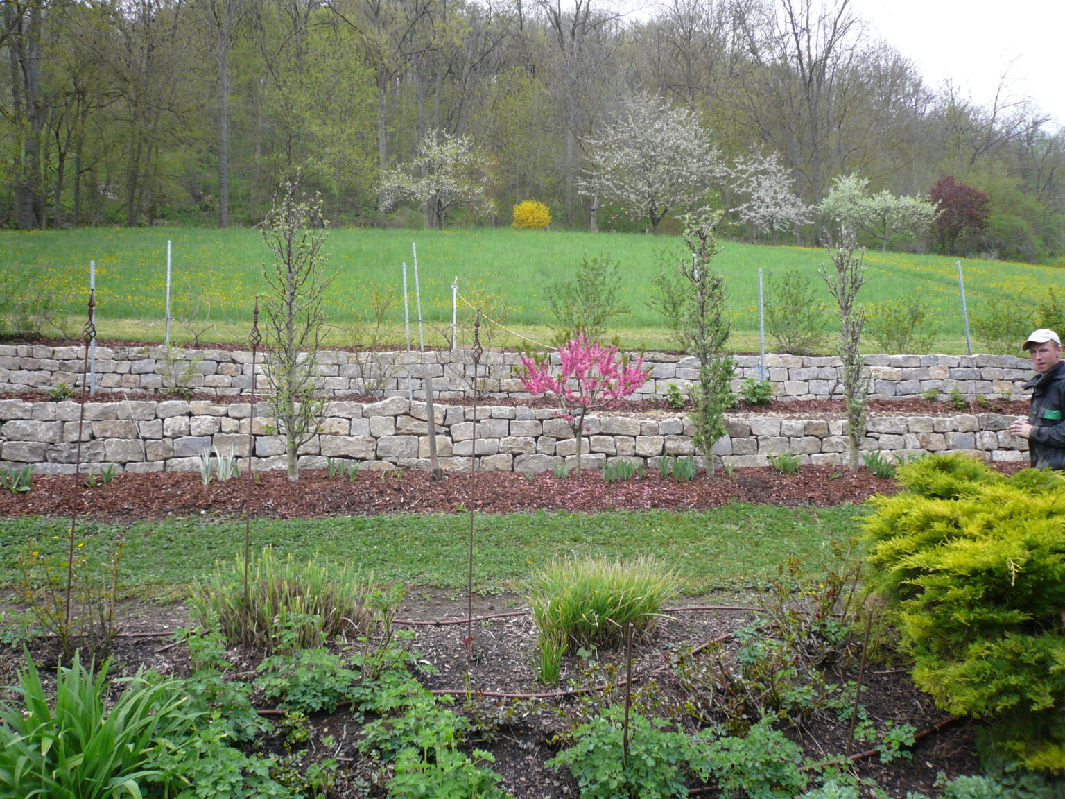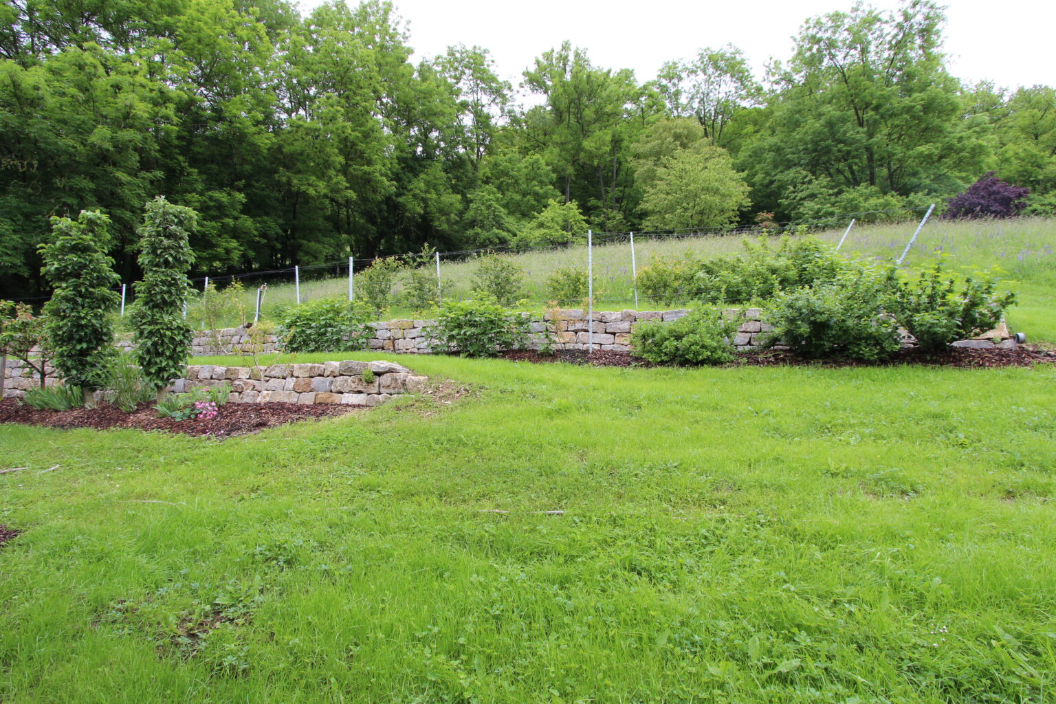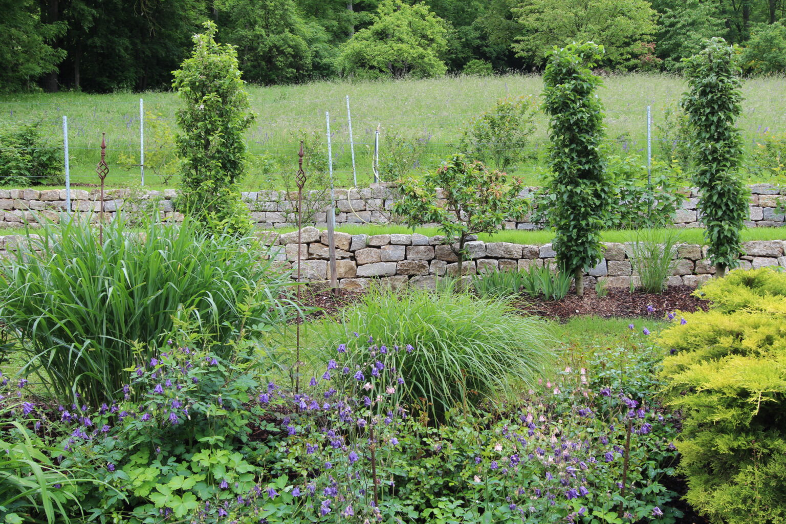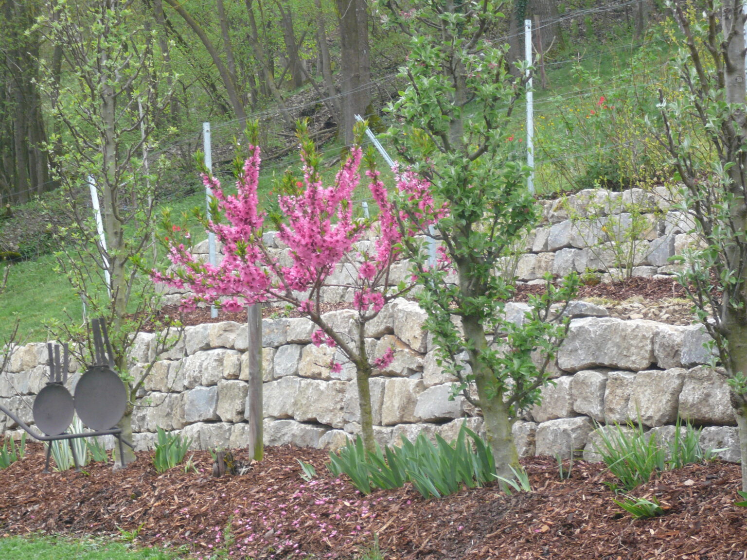 Hier wurde mit meheren Muschelkalkmauern der Hang abgesichert und schön bepflanzt. Auch eine Treppe mit Muschelkalkblockstufen wurde gebaut.