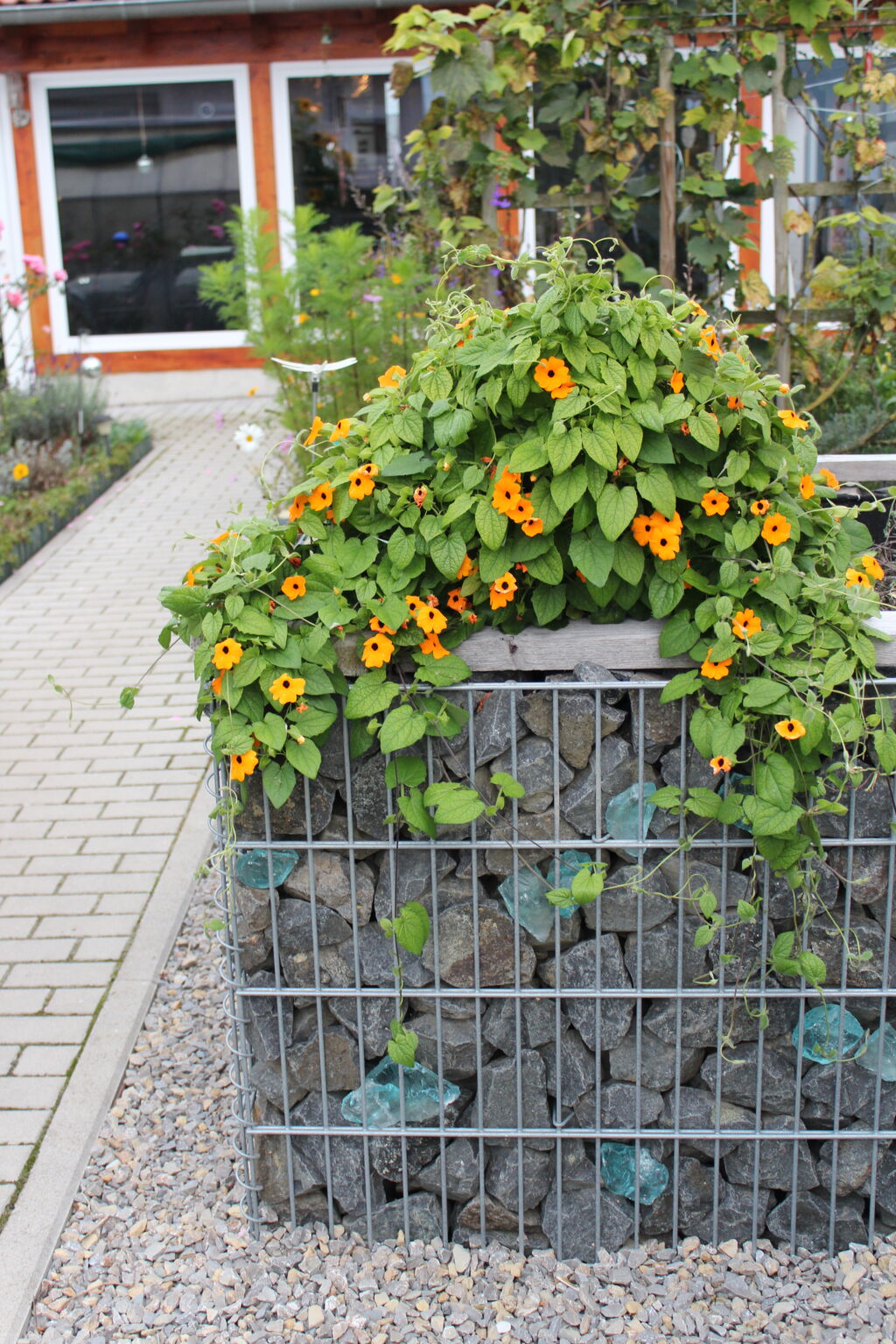 Mit Gabionen wurde hier ein Hochbeet gestaltet. Gefüllt mit schwarzen Basaltsteinen und vereinzelt blauen Glassteinen bildet die Gabione hier die perfekte Umrandung.