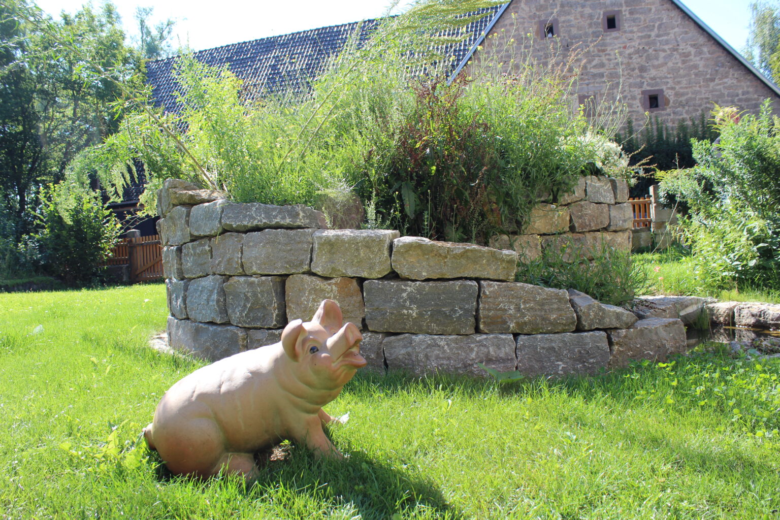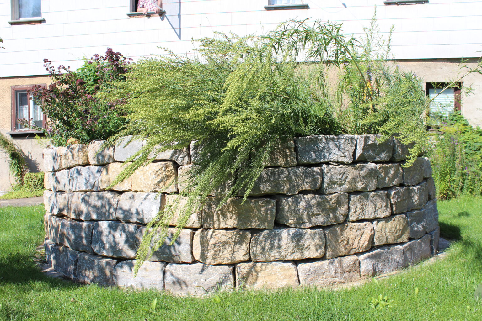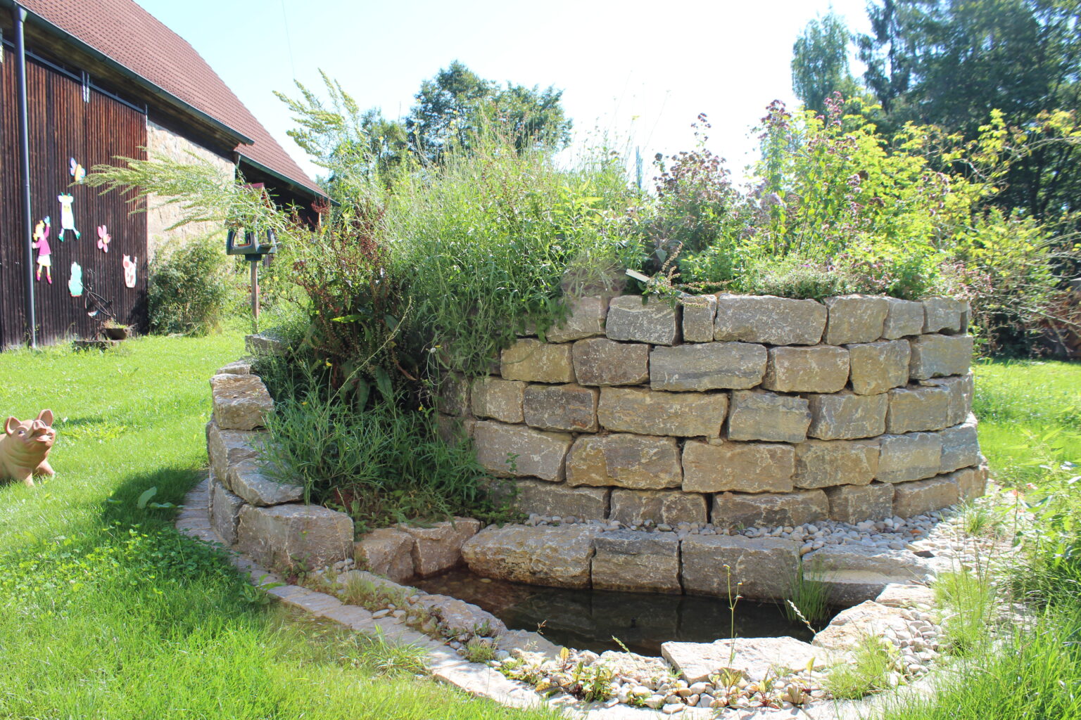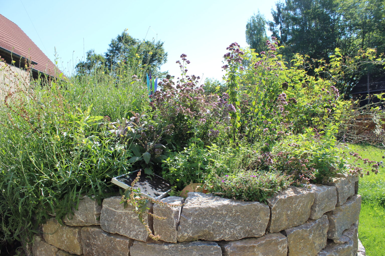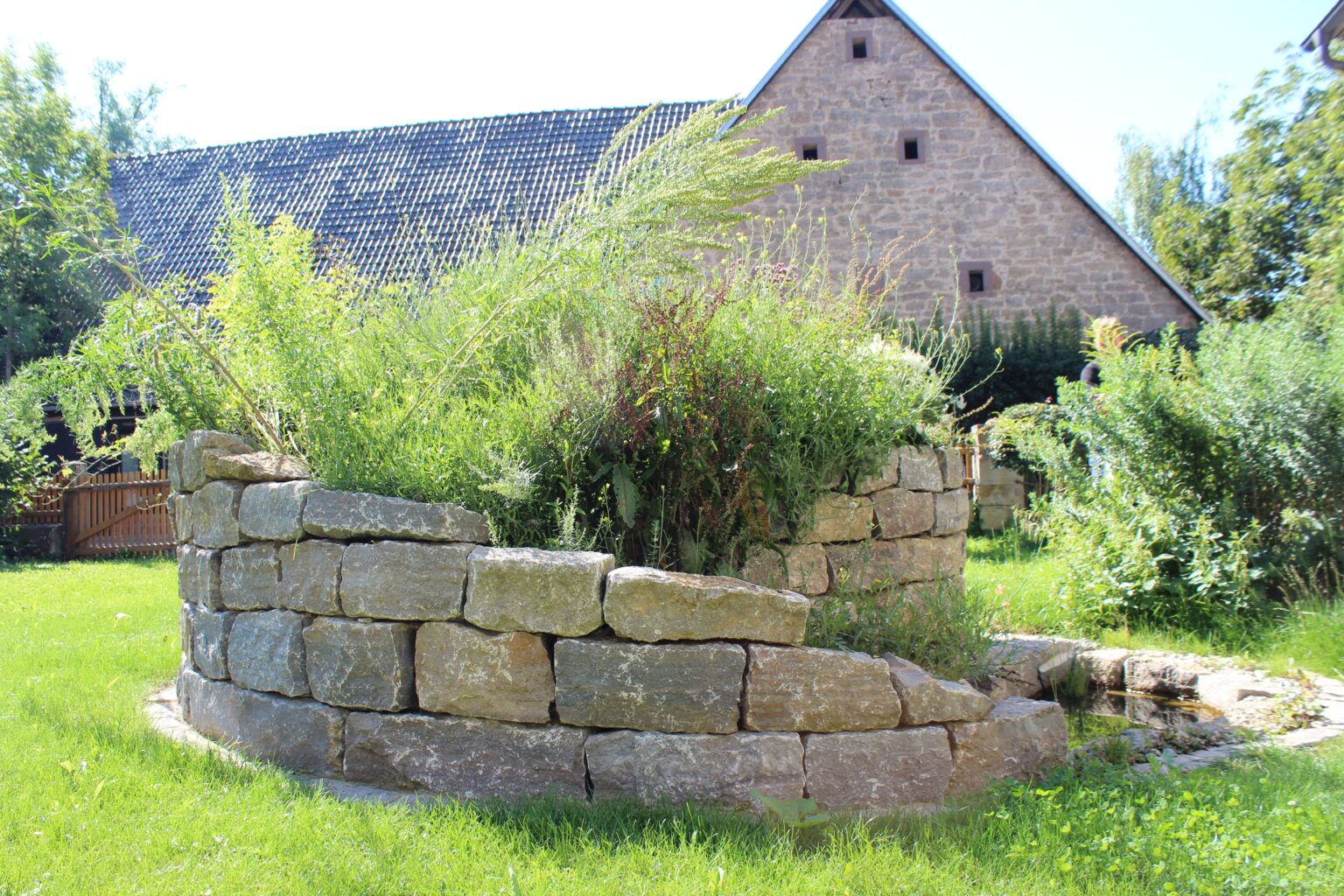 Eine Kräuterschnecke mit einem integrierten kleinen Teich wurde hier mit Muschelkalksteinen gebaut.