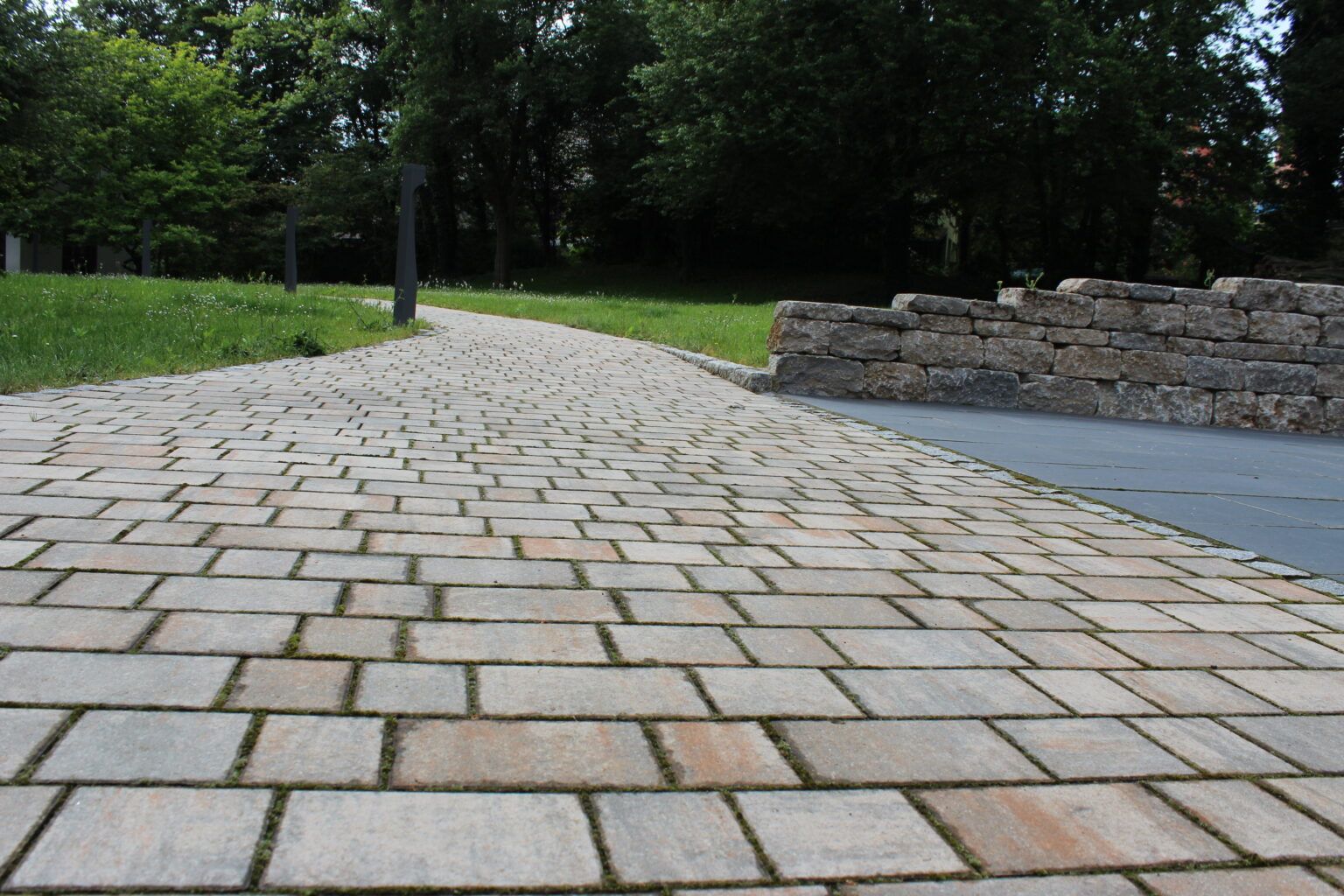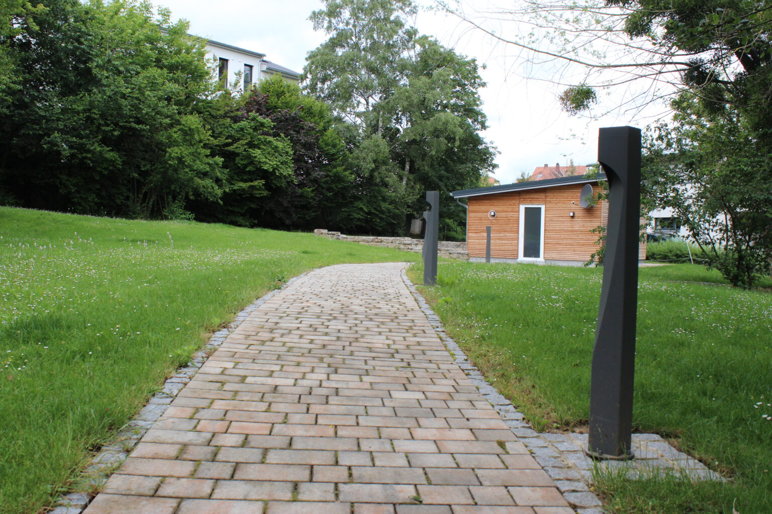 Ein schön gepflasterter Weg mit Beleuchtung bietet den optimalen Weg „trockenen Fußes“ hin zum Gartenhaus.