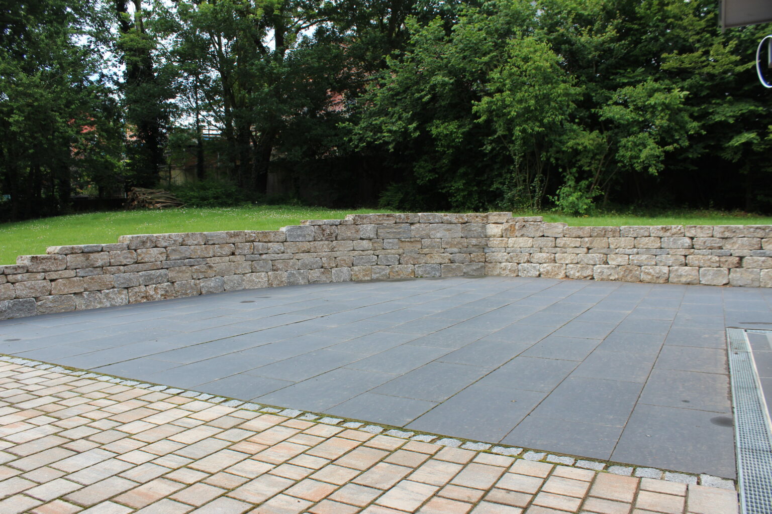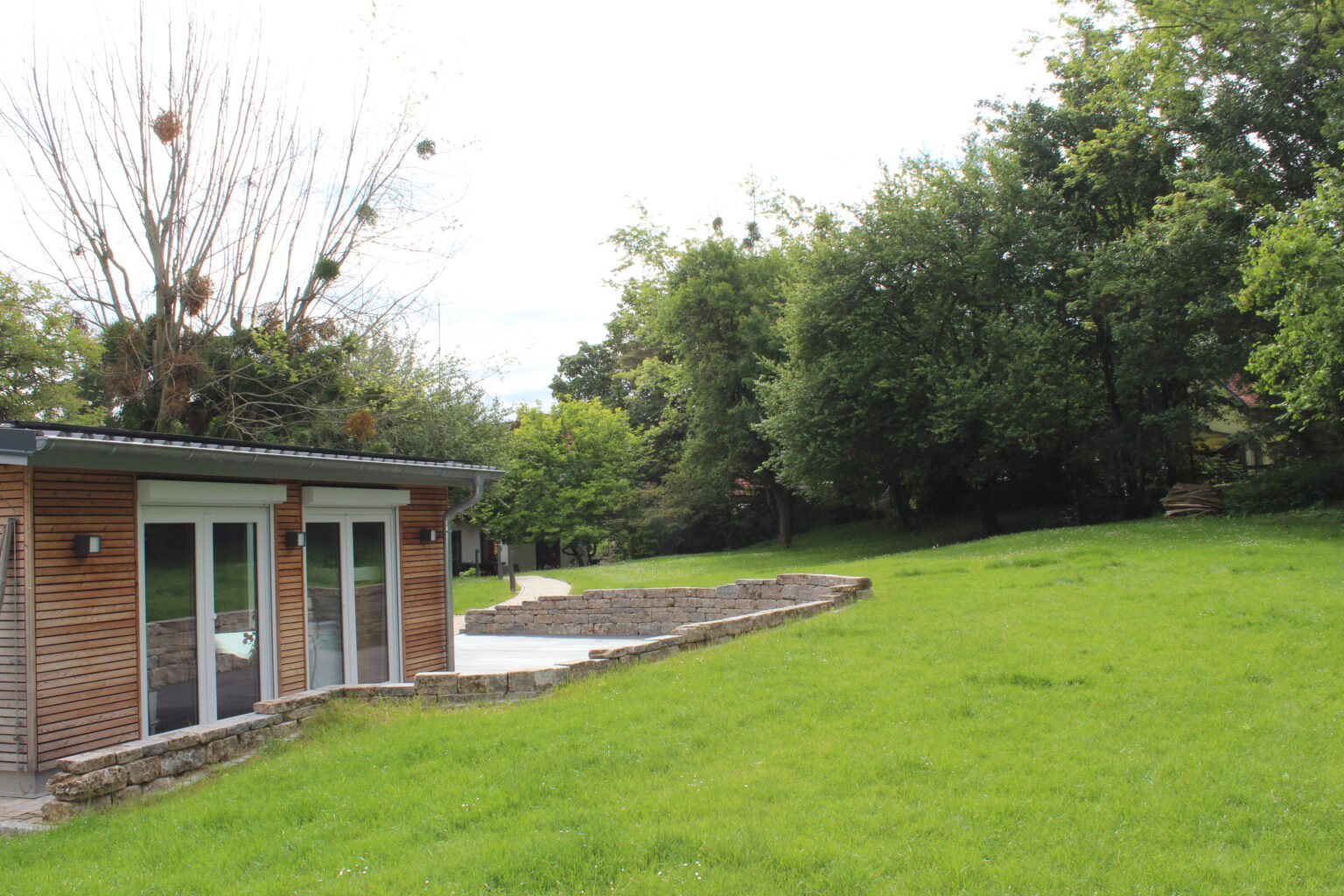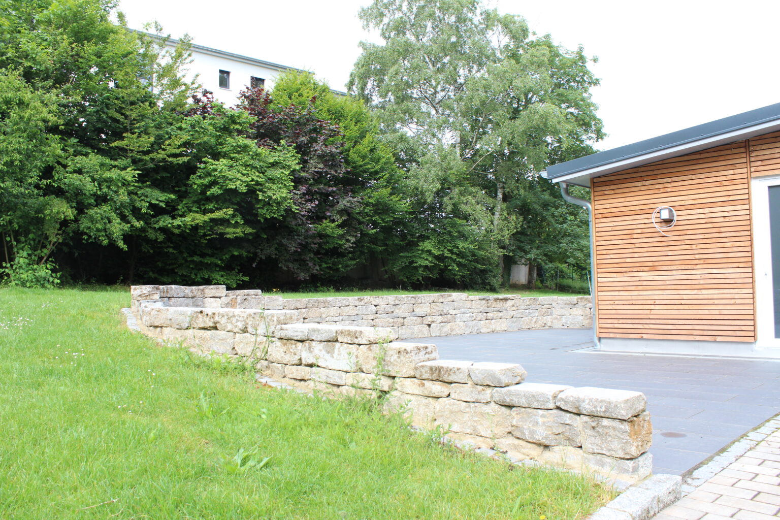 Um das Gartenhaus bestmöglich zu Nutzen war hier eine große Terrasse gewünscht. Mit einer Muschelkalkmauer wurde der Hang abgefangen um eine ebene Fläche zu schaffen.