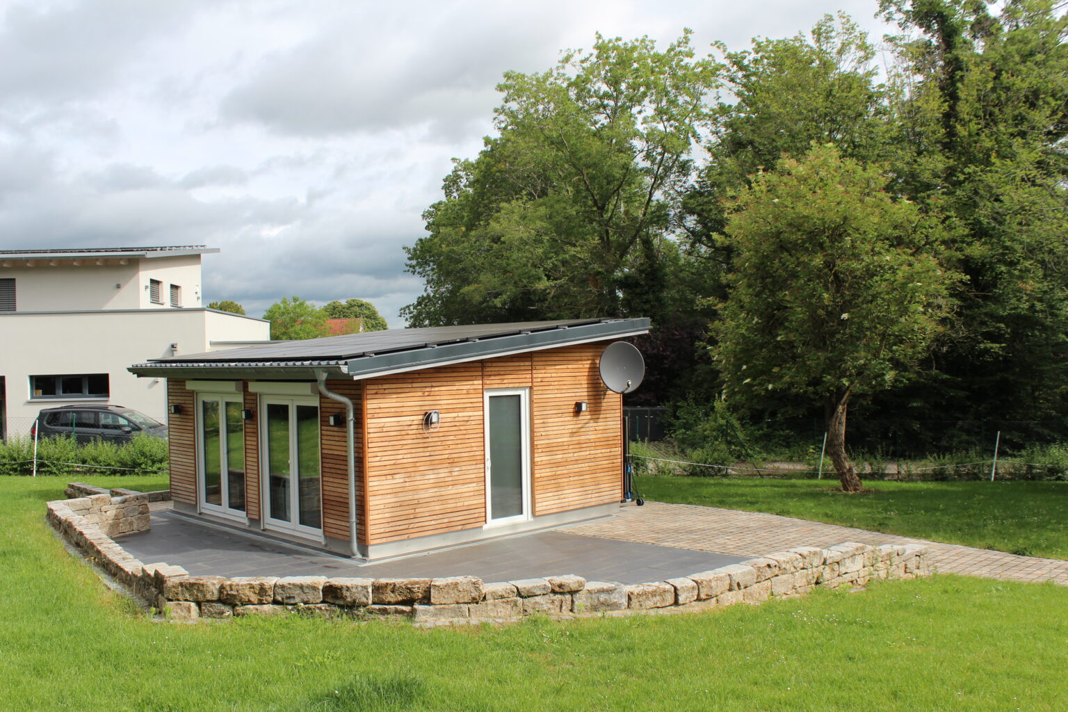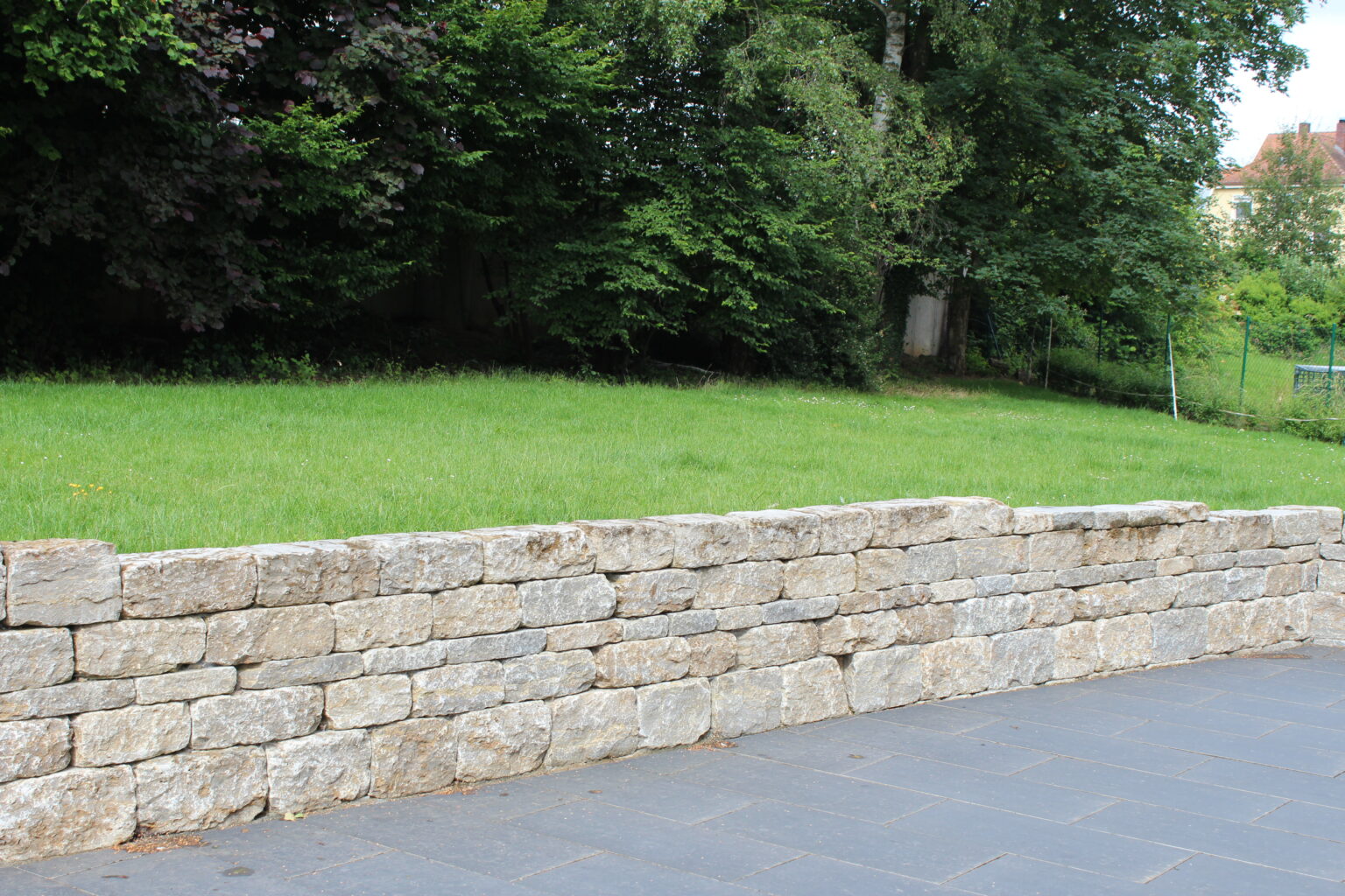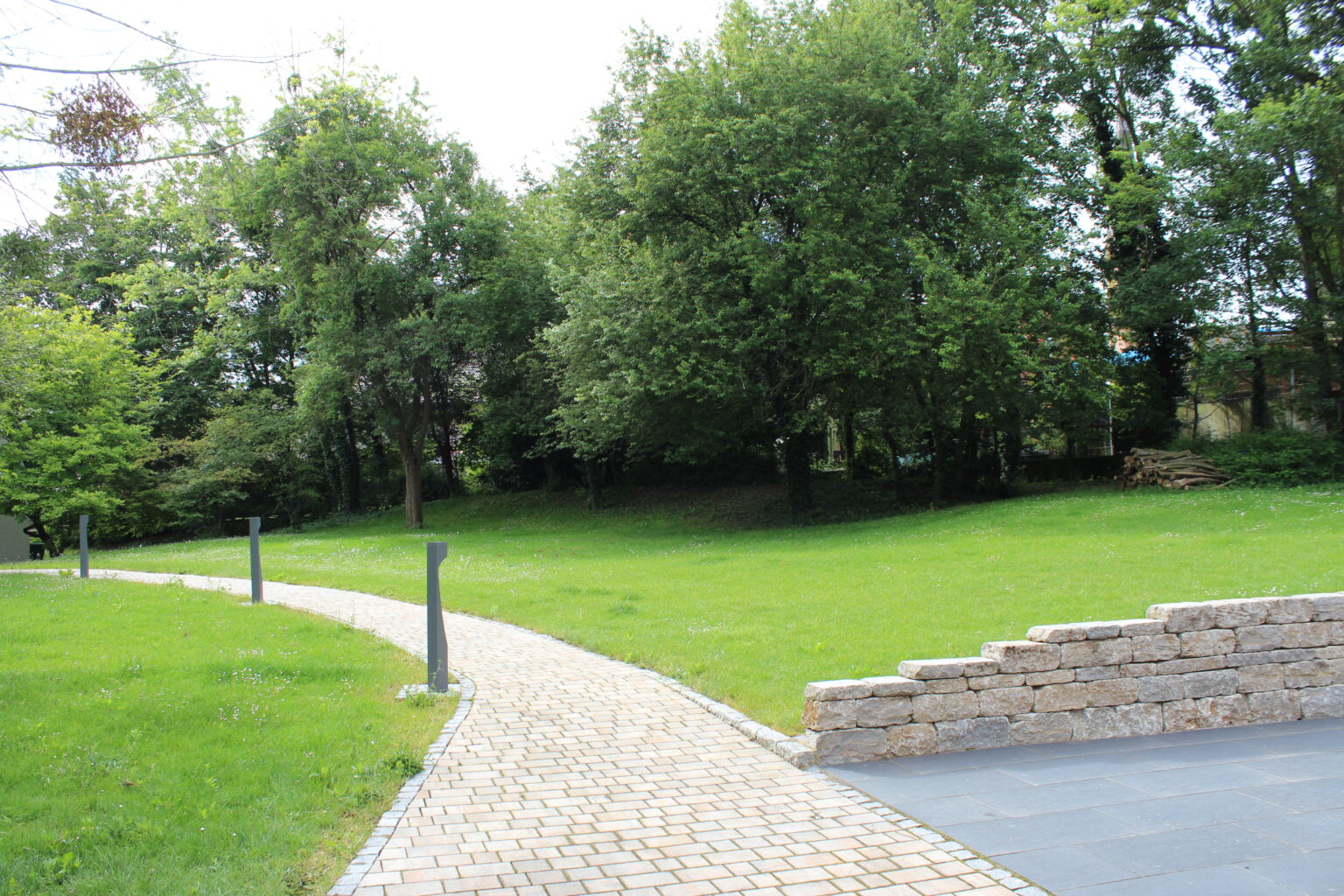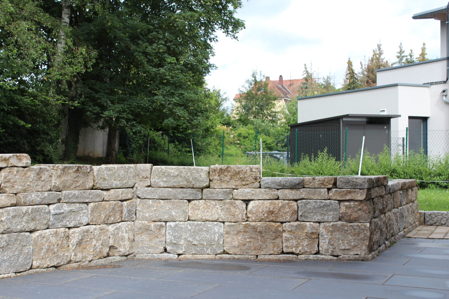 Um das Gartenhaus bestmöglich zu Nutzen war hier eine große Terrasse gewünscht. Mit einer Muschelkalkmauer wurde der Hang abgefangen um eine ebene Fläche zu schaffen.