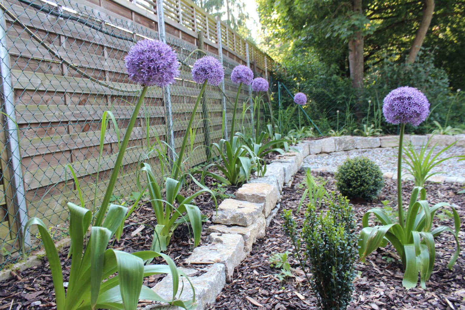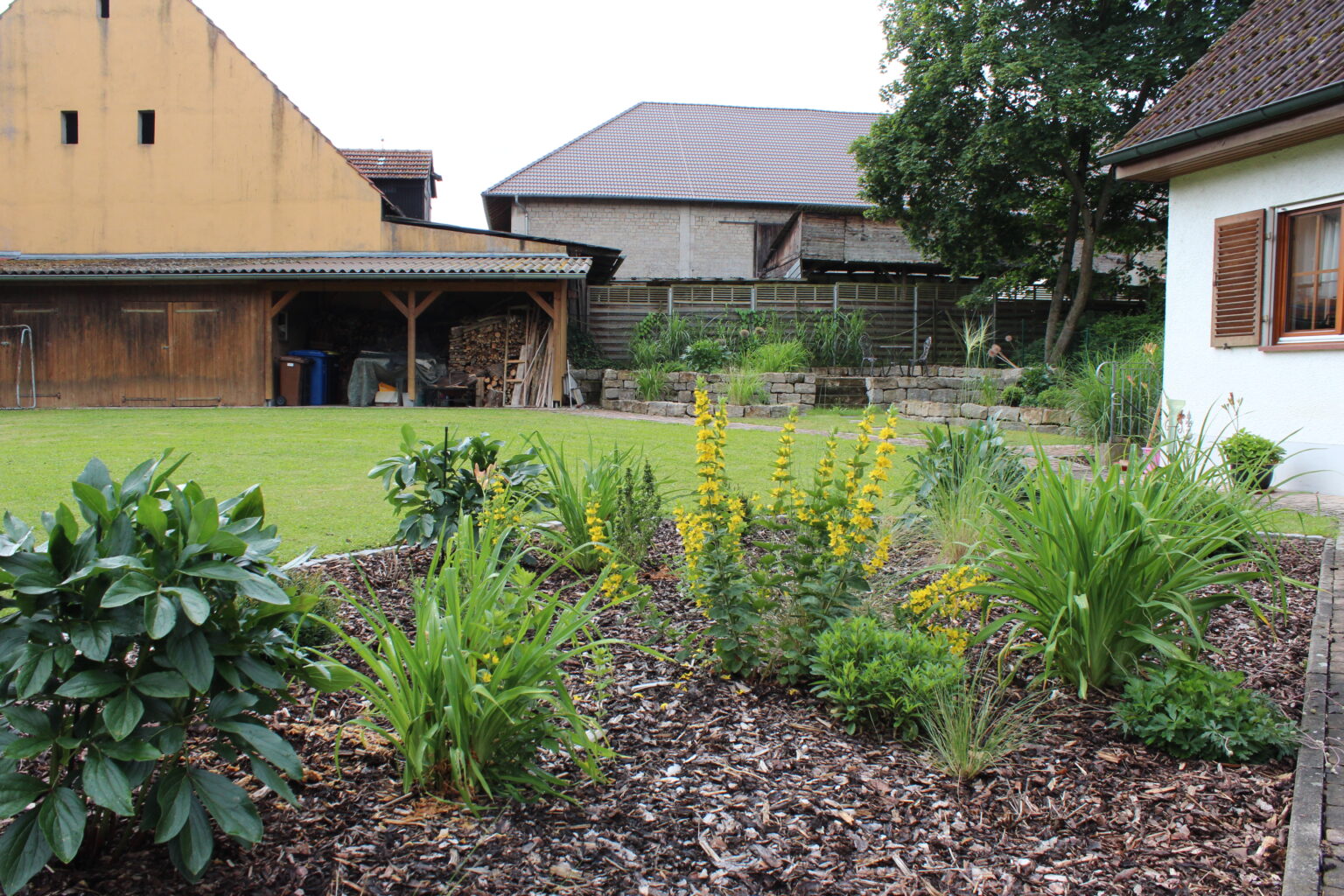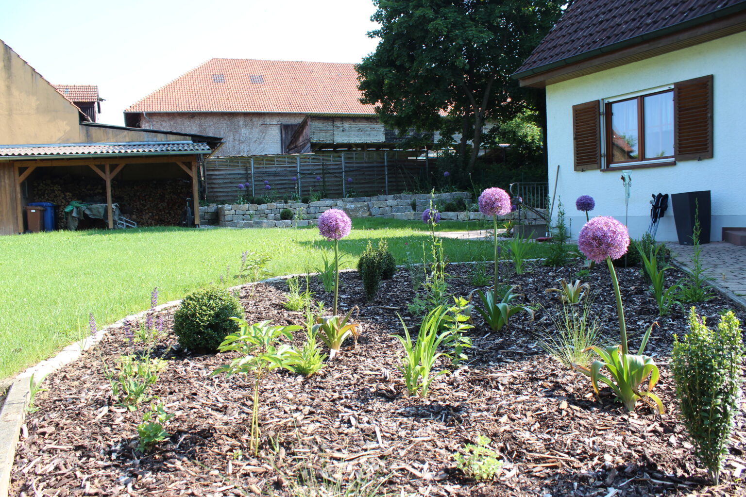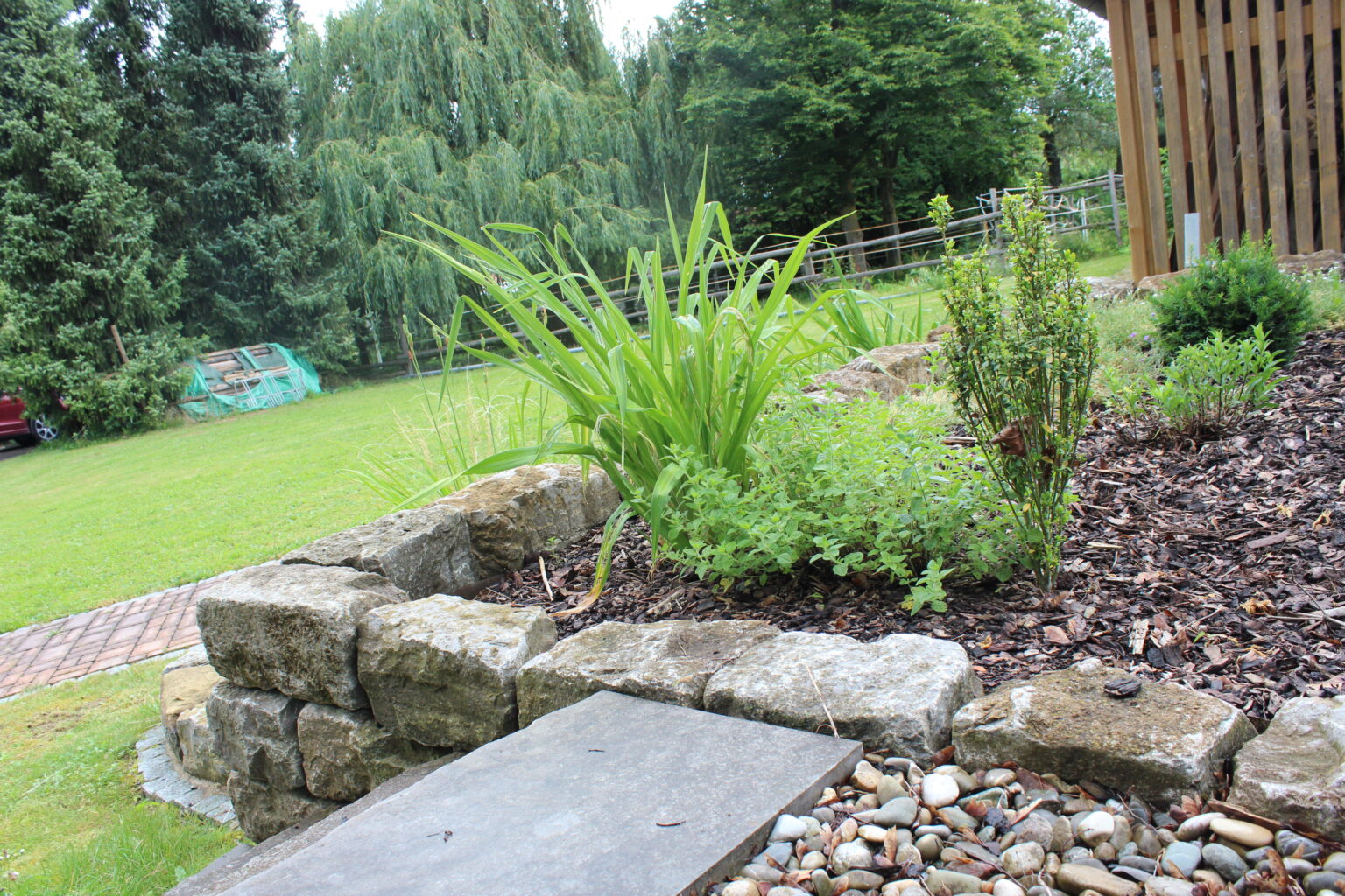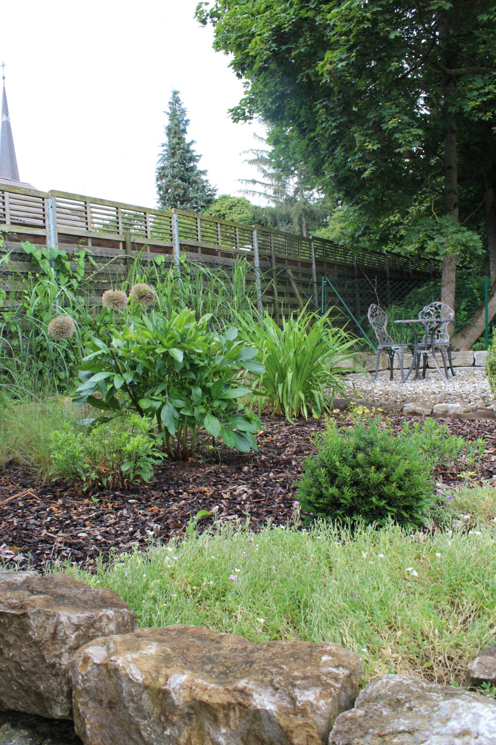 Der mit Kieselsteine bedeckte Sitzplatz wurde umrahmt von einem Beet mit viel Grün. Ausgewählte Pflanzen bieten einen herrlichen Platz zum Verweilen. Da können sich Insekten und Besitzer bei dem gemütlichen Beisammensein bestaunen.
