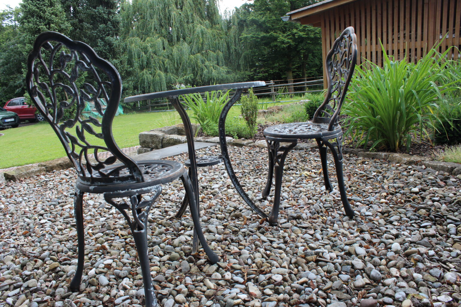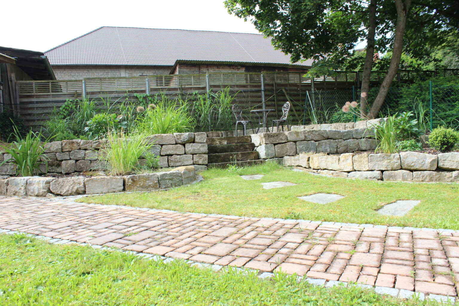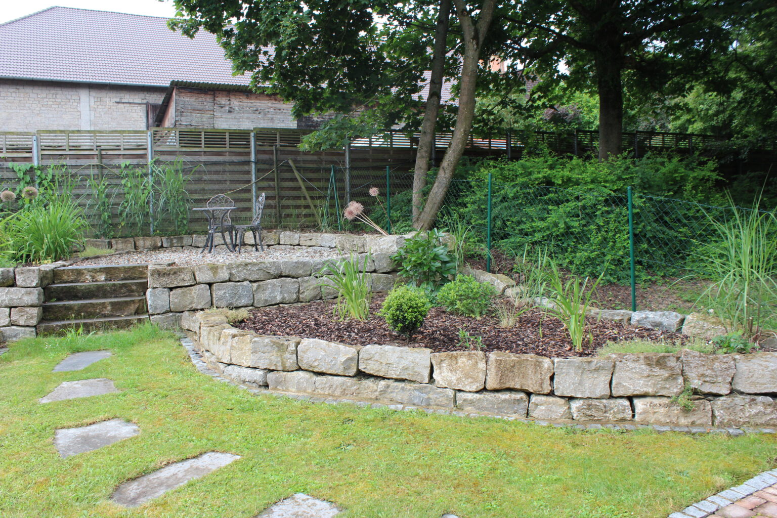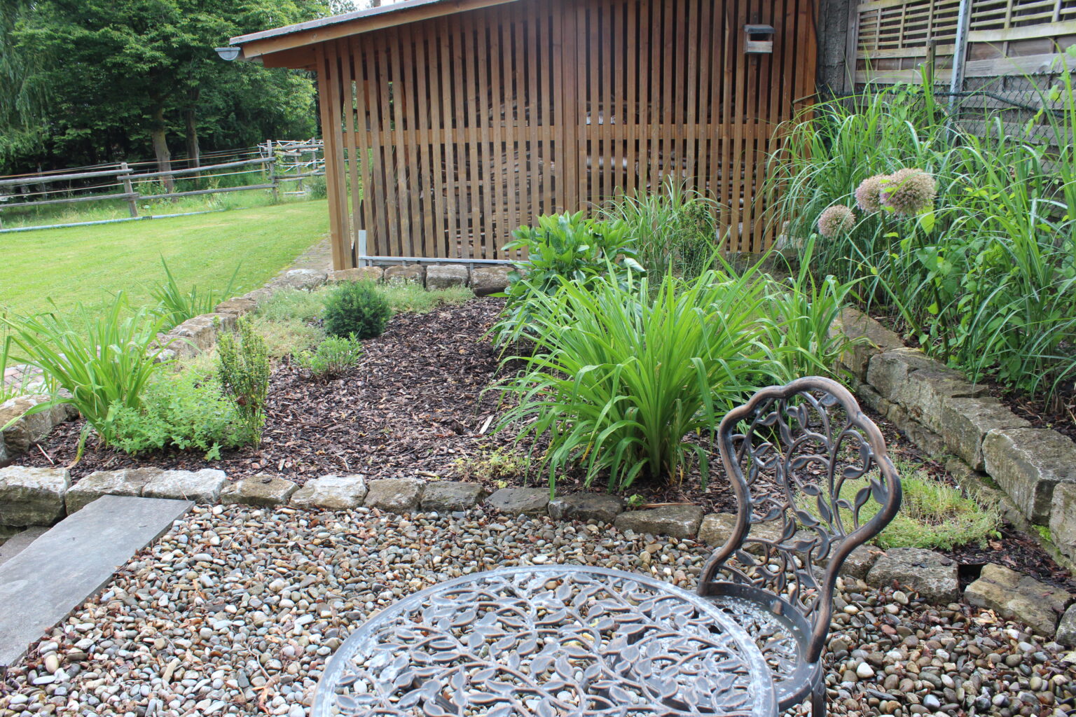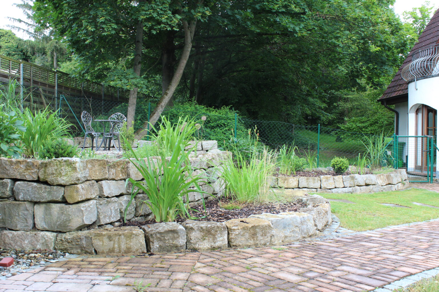 Der mit Kieselsteine bedeckte Sitzplatz wurde umrahmt von einem Beet mit viel Grün. Ausgewählte Pflanzen bieten einen herrlichen Platz zum Verweilen. Da können sich Insekten und Besitzer bei dem gemütlichen Beisammensein bestaunen.