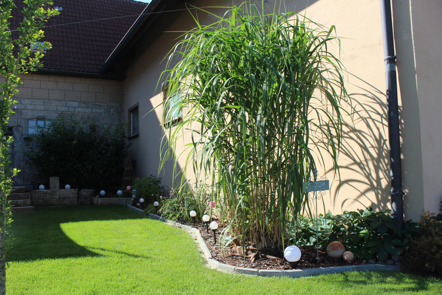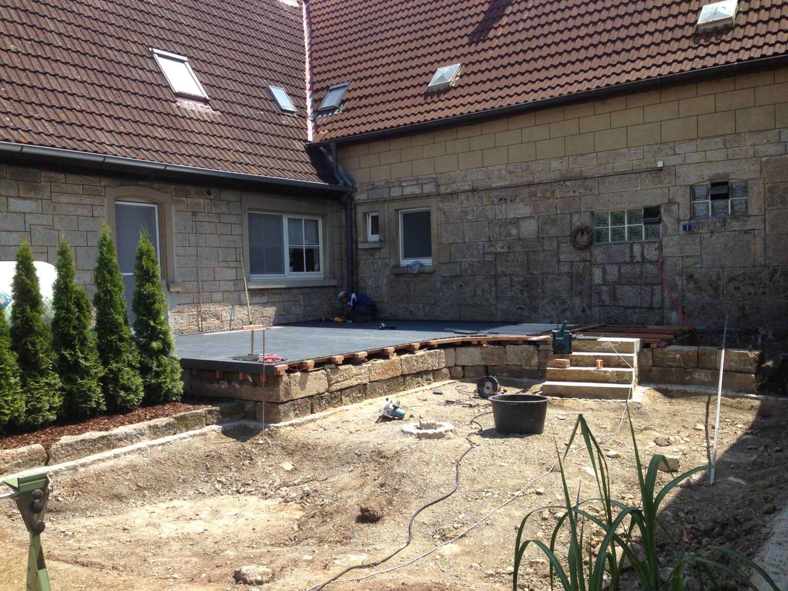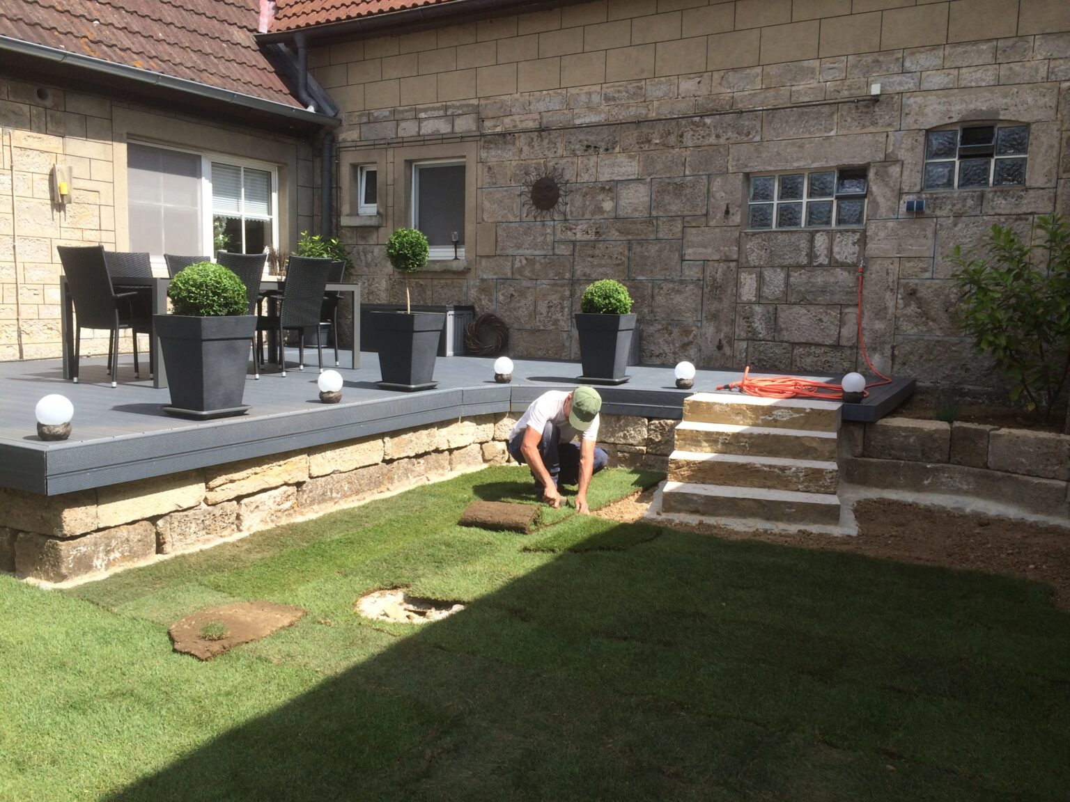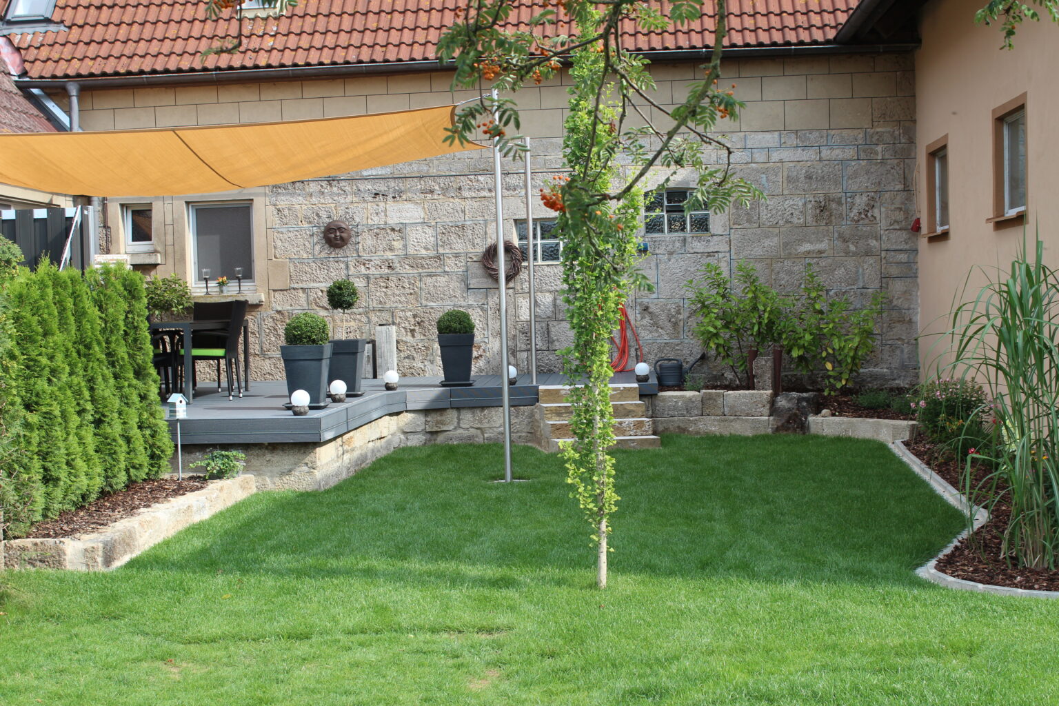 Das schattige Plätzchen läd dank Sonnensegel zum Verweilen auf der neuen Terrasse ein. Der perfekte Rollrasen rundet das Gesamtbild ab.