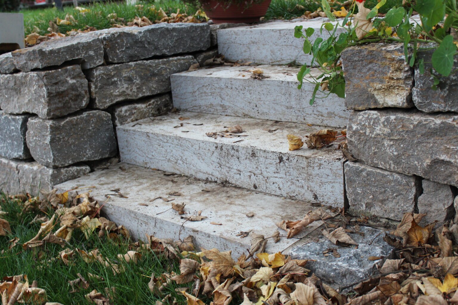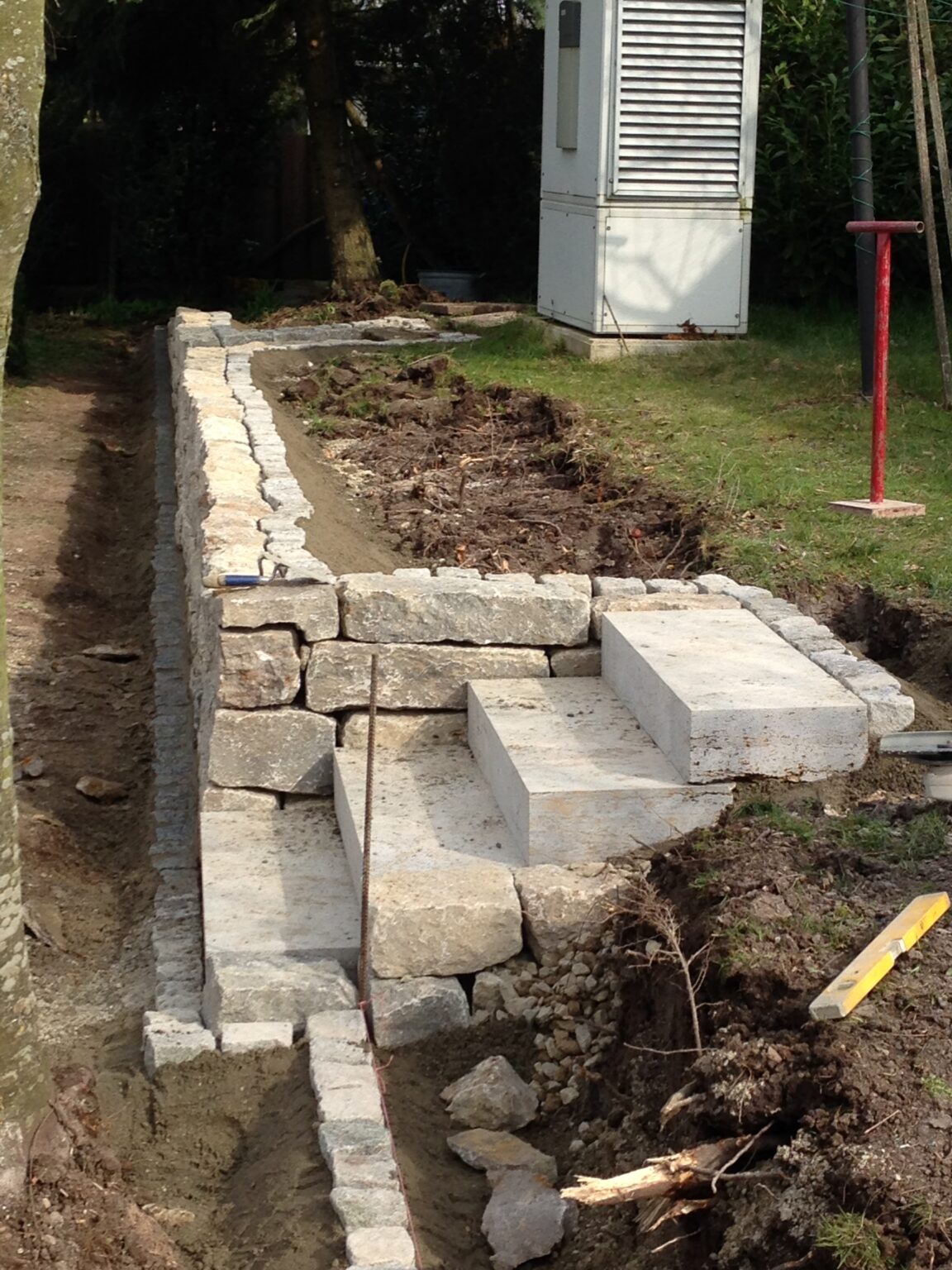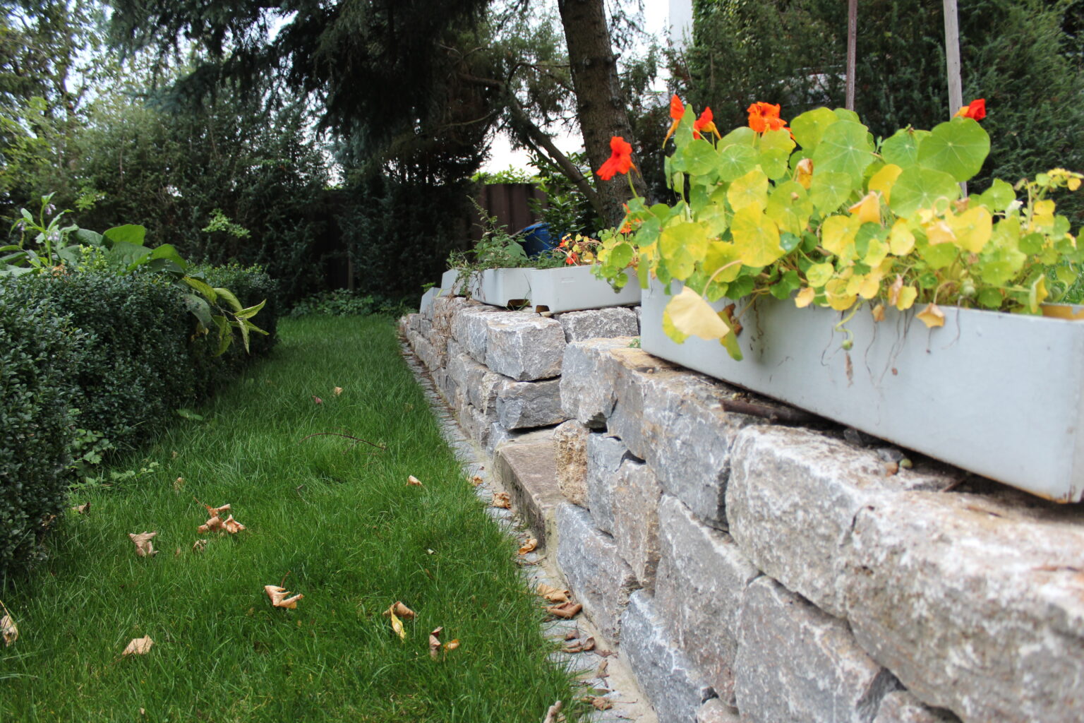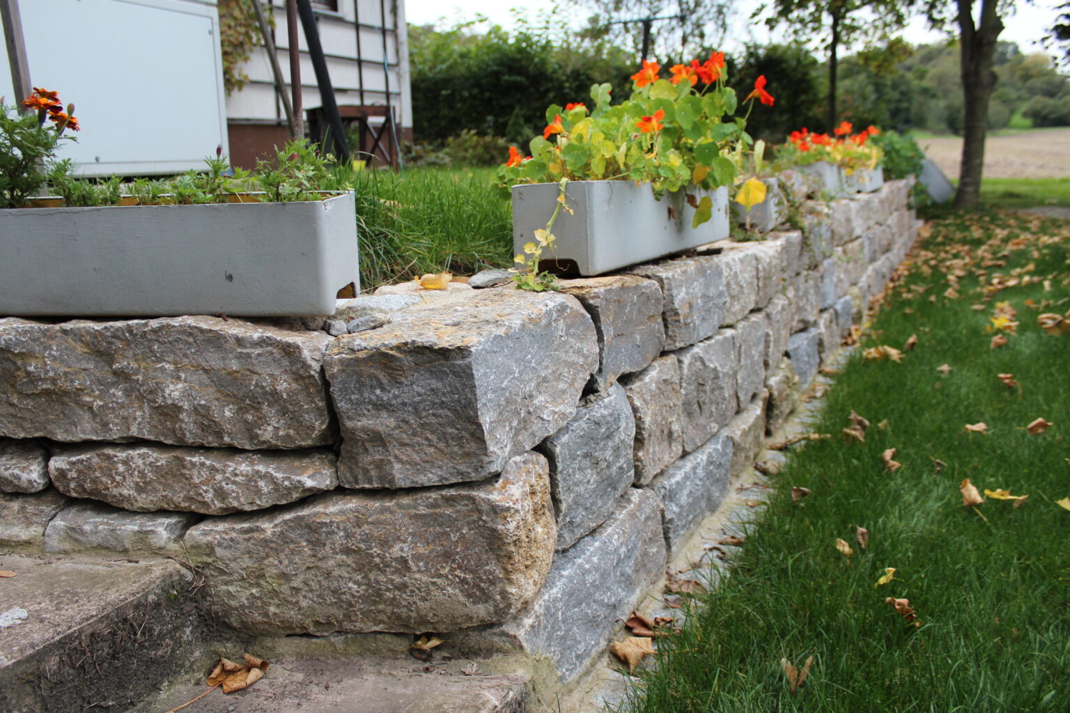 Um eine größere Fläche ohne Hang zu erhalten wurde hier eine Mauer aus Muschelkalk verwirktlicht. Die Treppe aus Blockstufen im selben Material fügt sich optisch perfekt ins Bild.