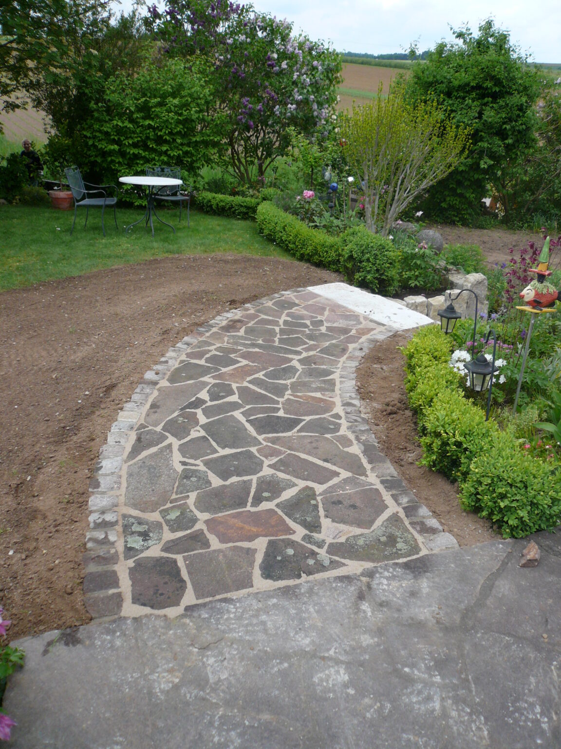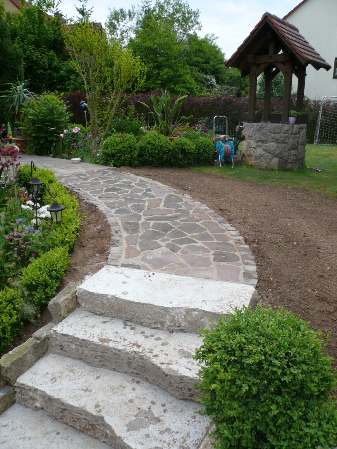 Zu sehen ist hier eine schöne Treppe aus Muschelkalksteinen und ein Weg mit Trittplatten, verlegt im wilden Verband.